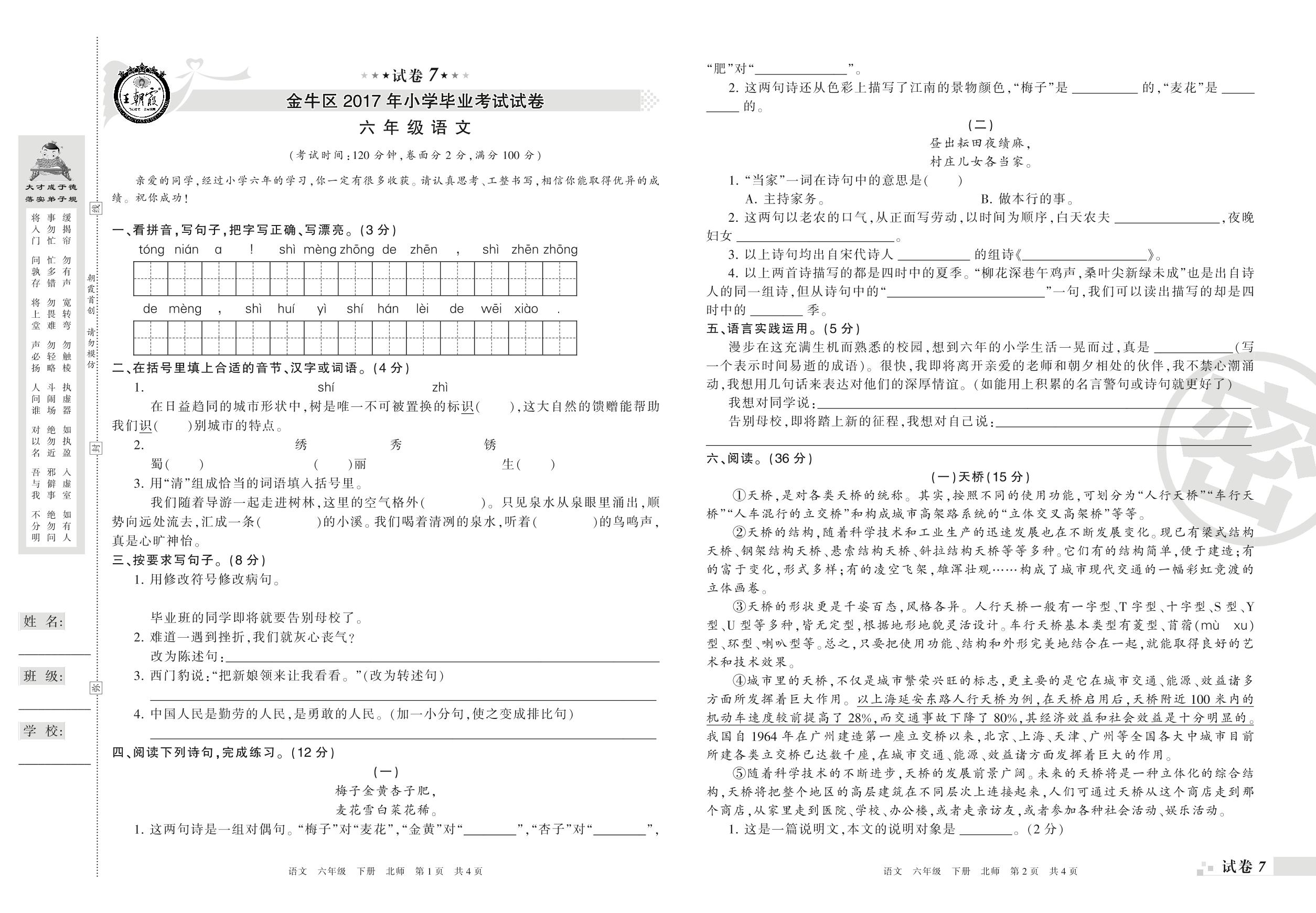 2016-2017学年第二学期成都市金牛区六年级语文试卷(北师版)【7】