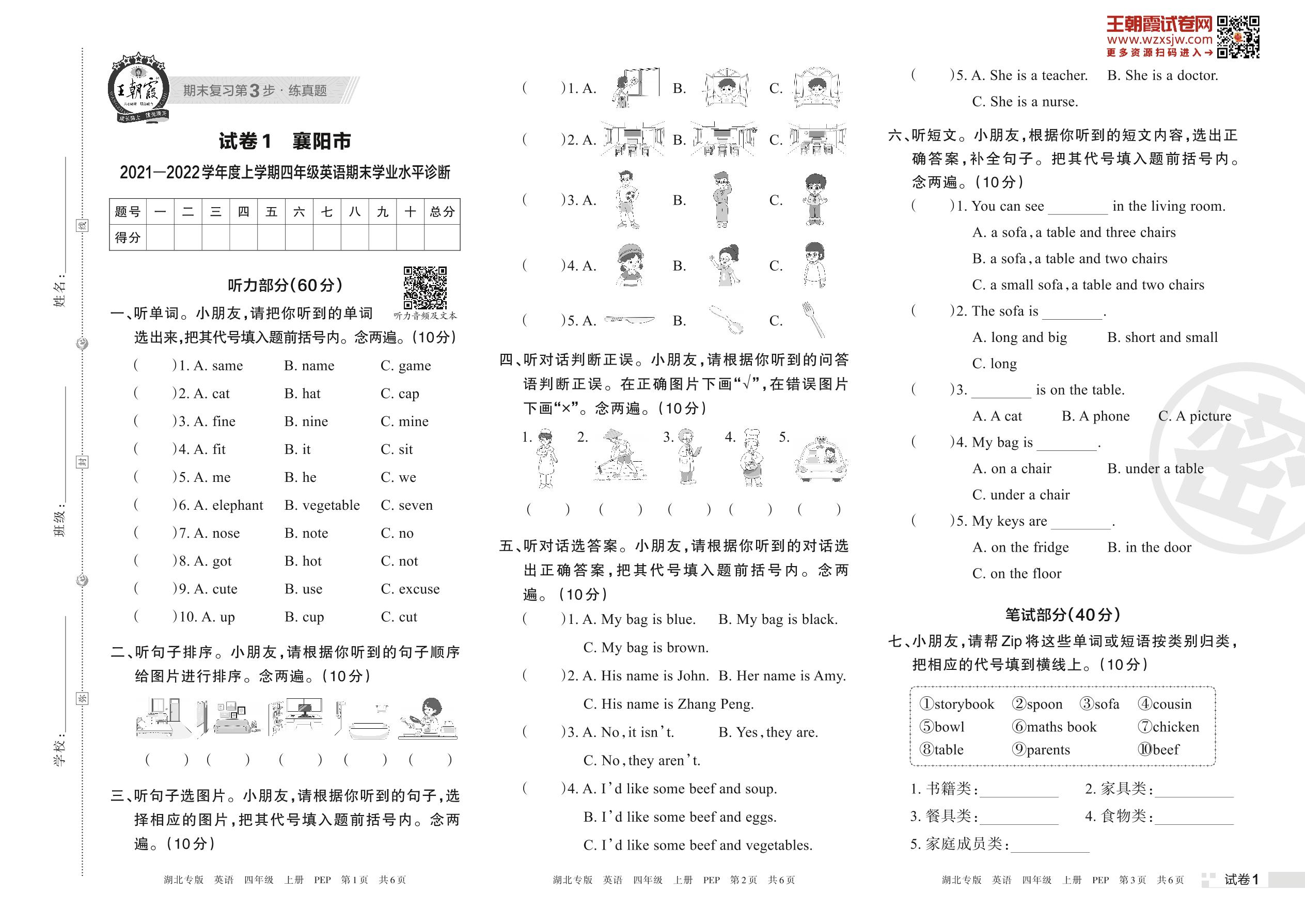襄阳市2021—2022学年度上学期四年级英语期末学业水平诊断(PEP版)【1】