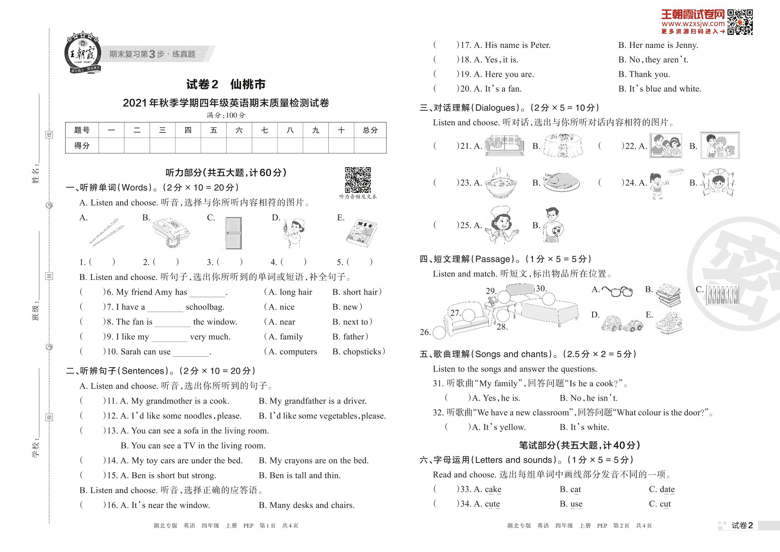 仙桃市2021年秋季学期四年级英语期末质量检测试卷(PEP版)【2】