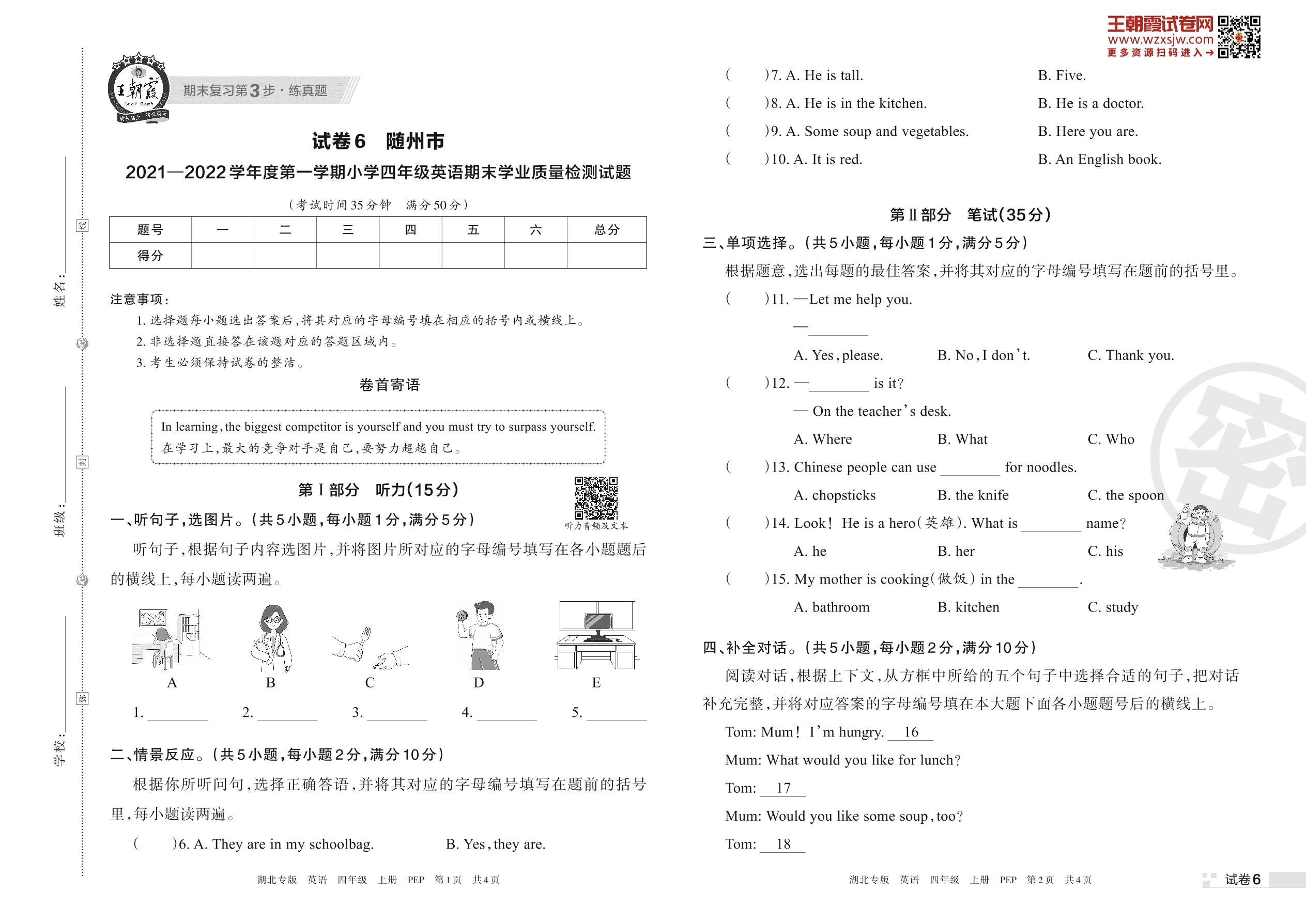 随州市2021—2022学年度第一学期小学四年级英语期末学业质量检测试题(PEP版)【6】