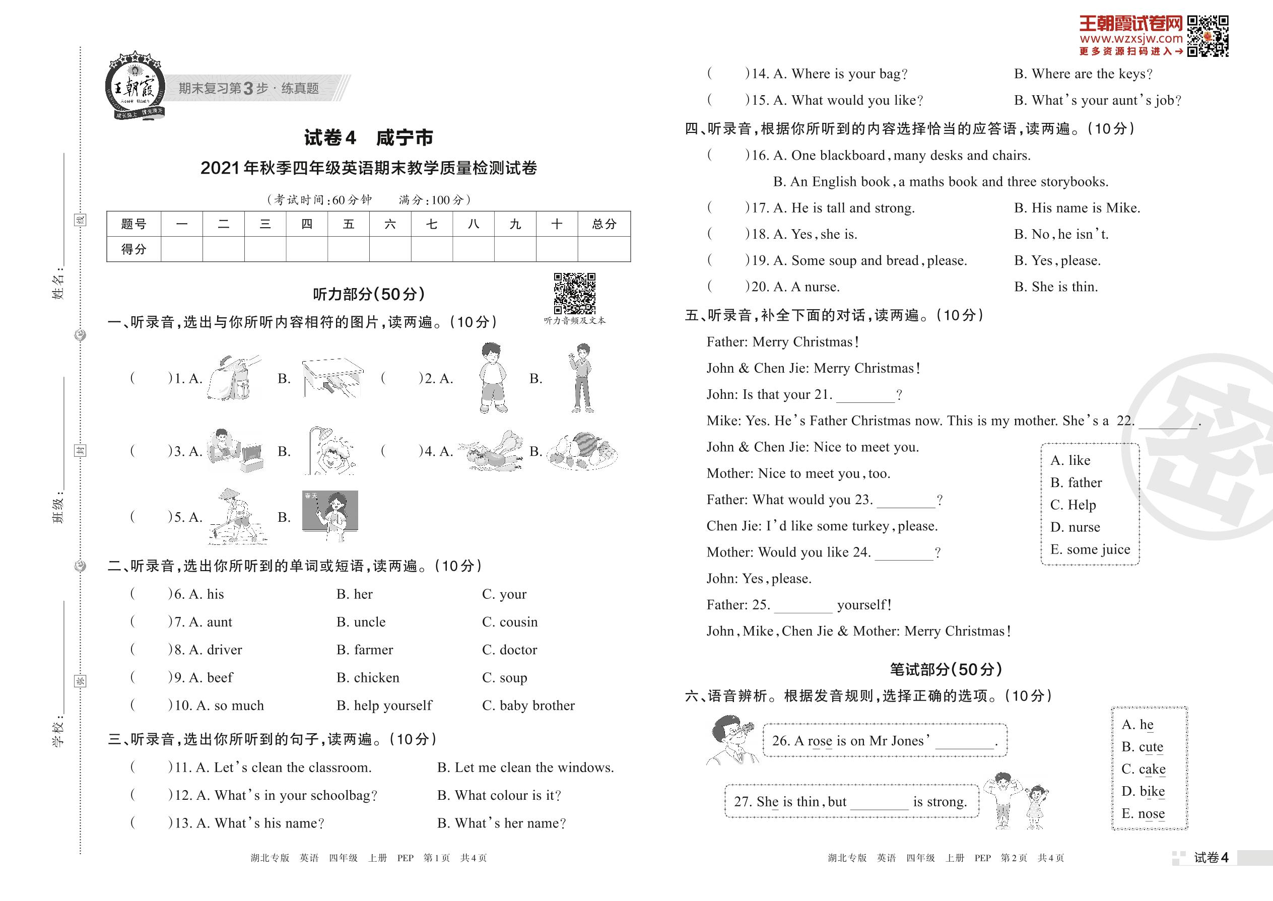 咸宁市2021年秋季四年级英语期末教学质量检测试卷(PEP版)【4】