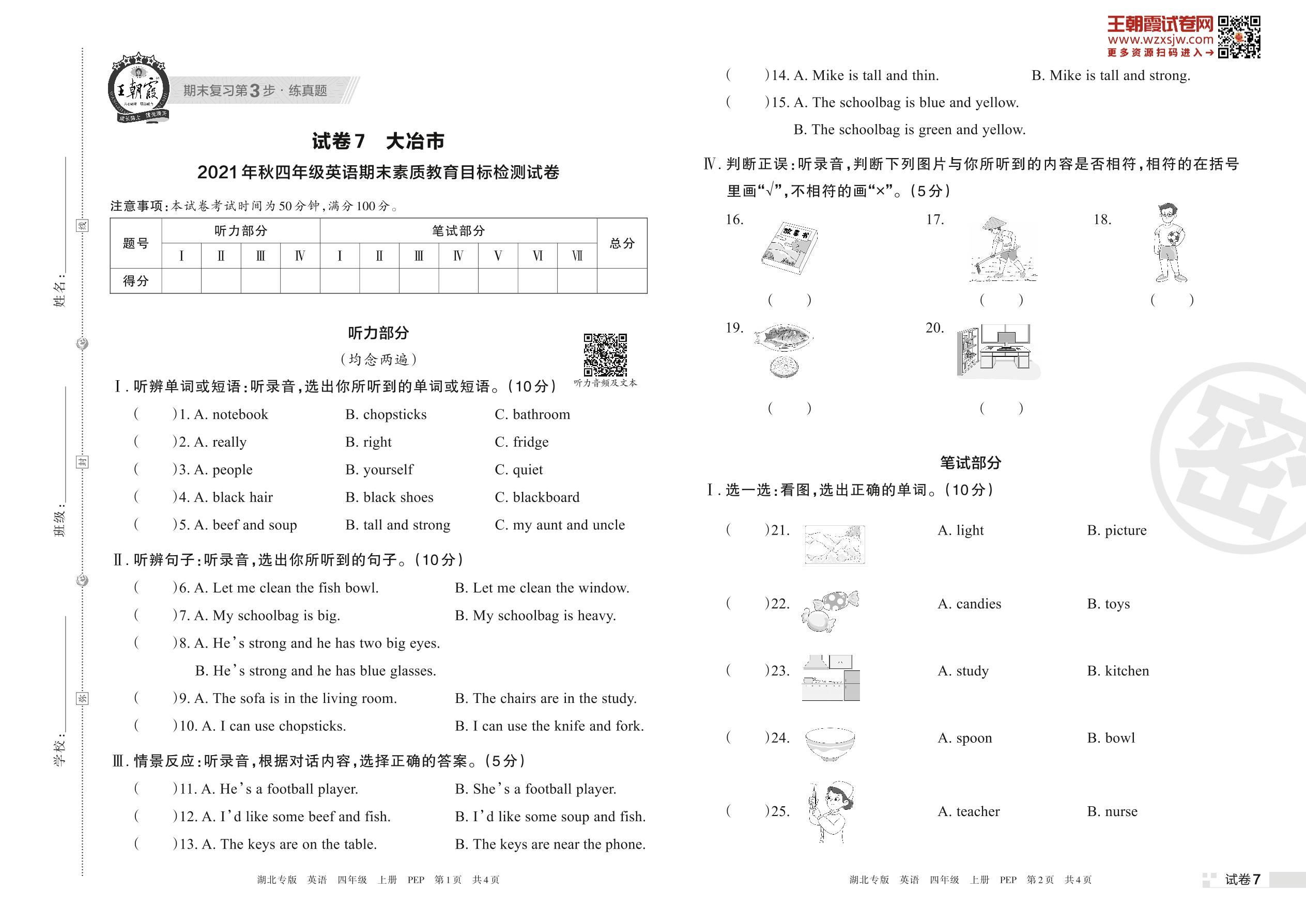 大冶市2021年秋四年级英语期末素质教育目标检测试卷(PEP版)【7】