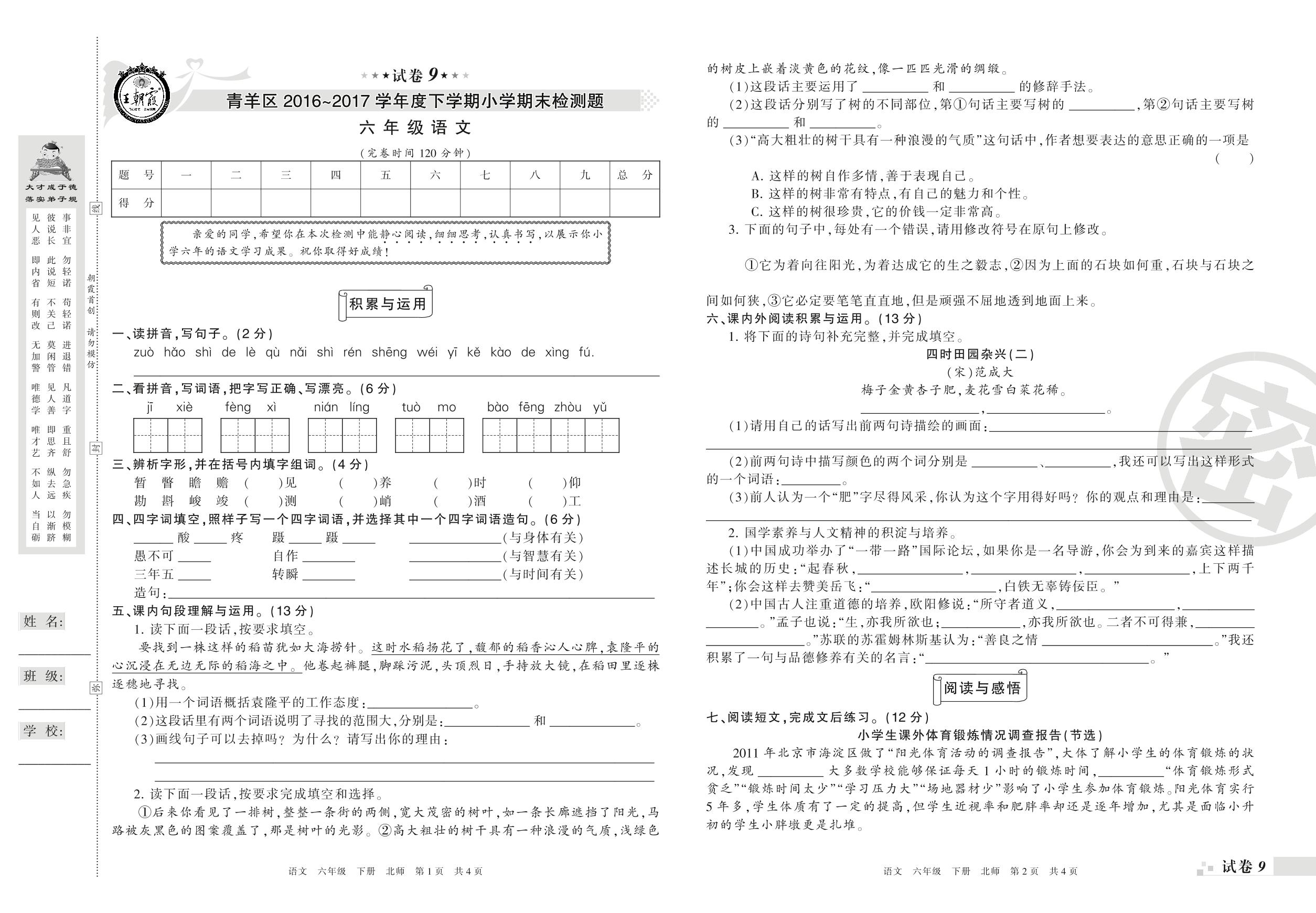 2016-2017学年第二学期成都市青羊区六年级语文试卷(北师版)【9】
