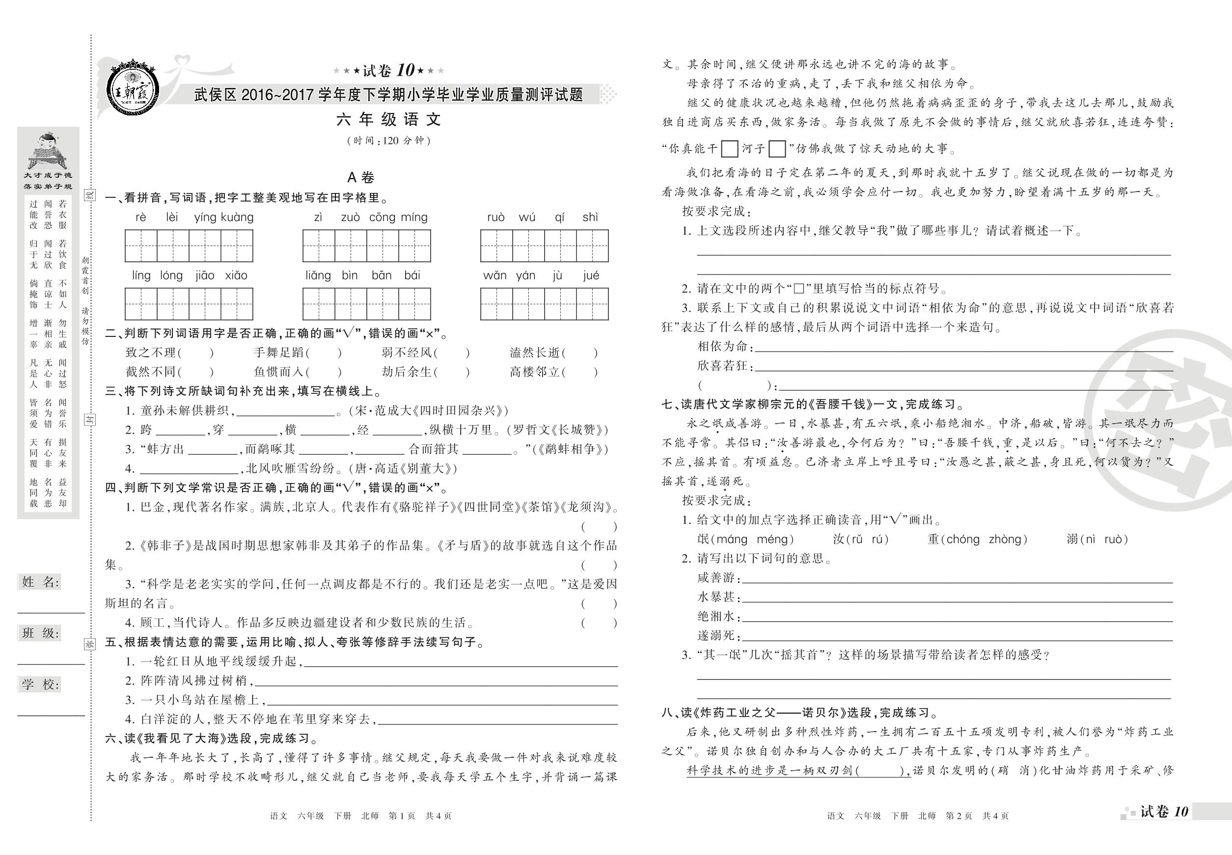 2016-2017学年第二学期成都市武侯区六年级语文试卷(北师版)【10】