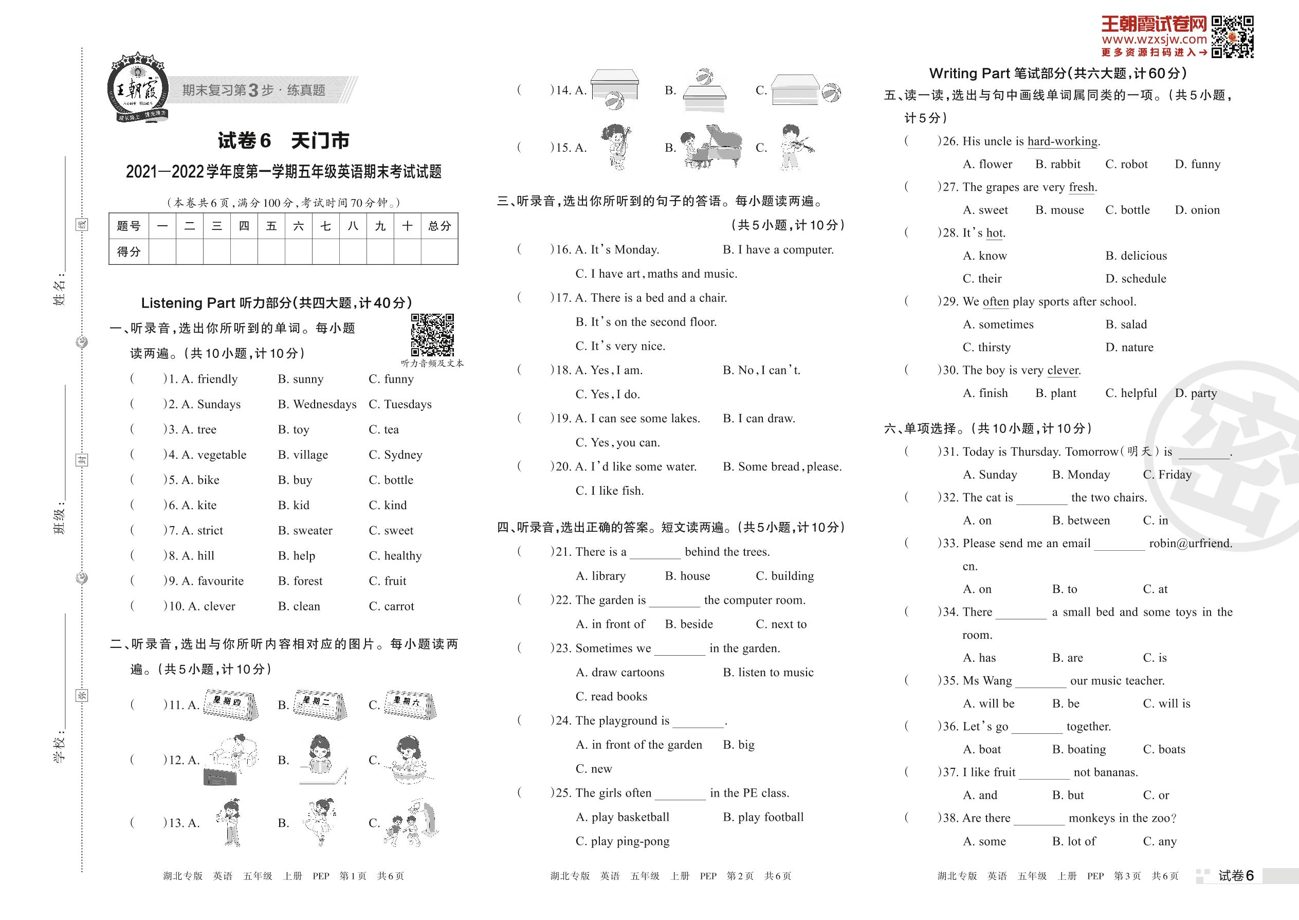 天门市2021—2022学年度第一学期五年级英语期末考试试题(PEP版)【6】