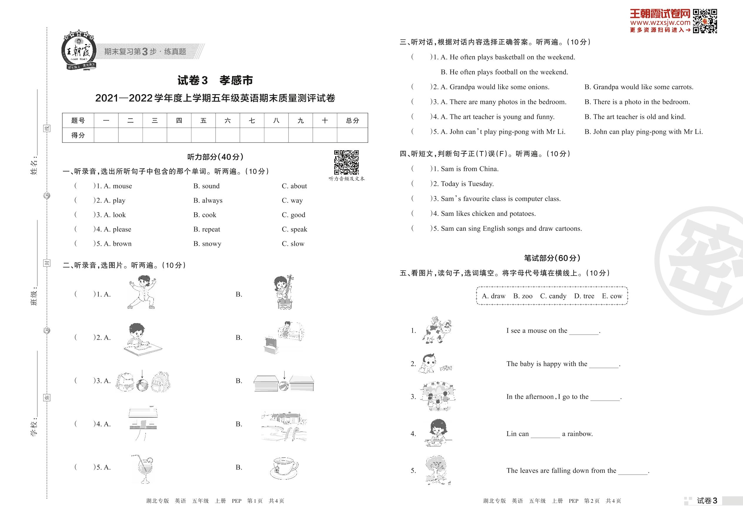 孝感市2021—2022学年度上学期五年级英语期末质量测评试卷(PEP版)【3】