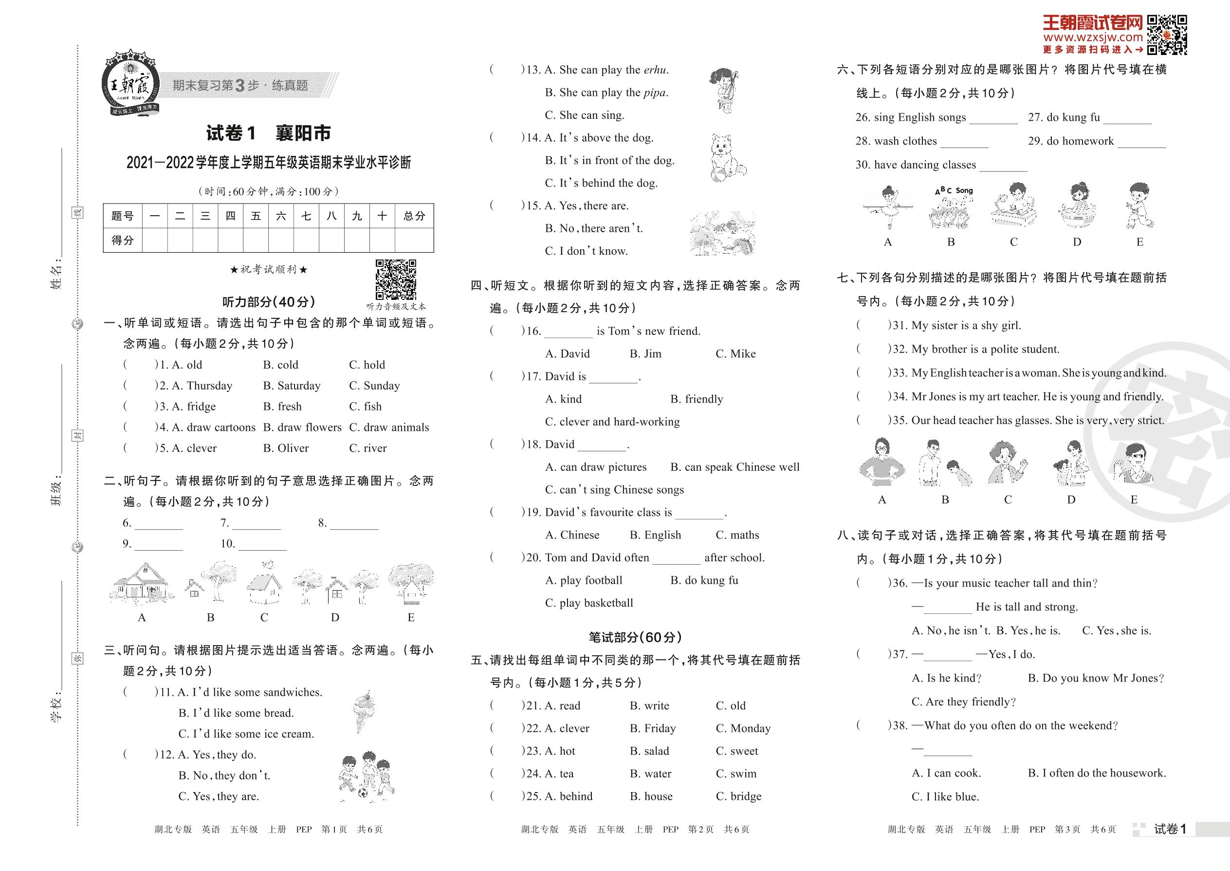 襄阳市2021—2022学年度上学期五年级英语期末学业水平诊断(PEP版)【1】