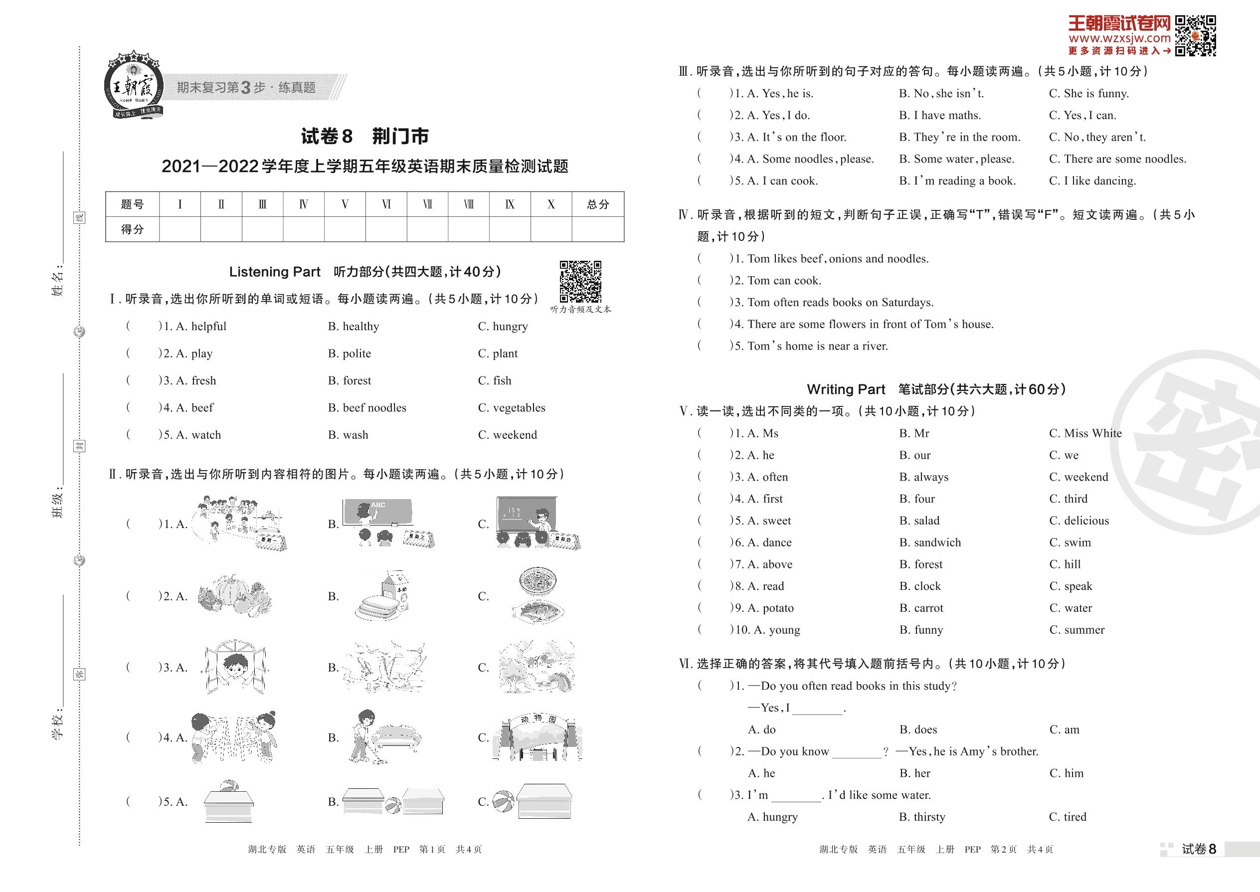 荆门市2021—2022学年度上学期五年级英语期末质量检测试题 (PEP版)【8】