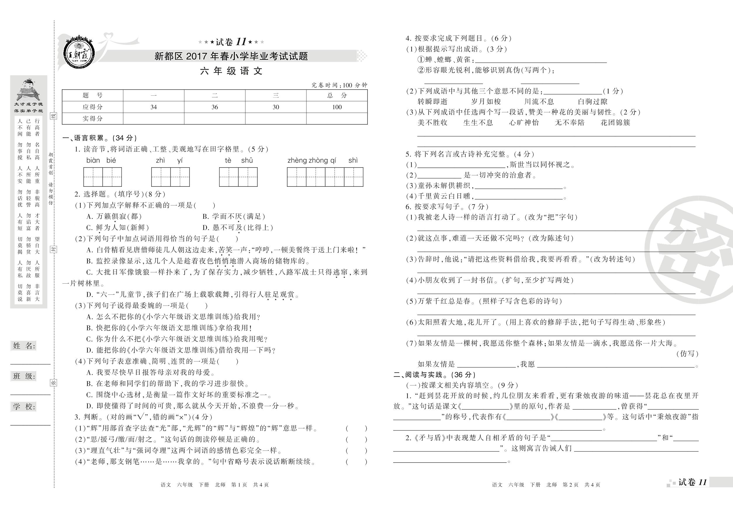 2016-2017学年第二学期成都市新都区六年级语文试卷(北师版)【11】