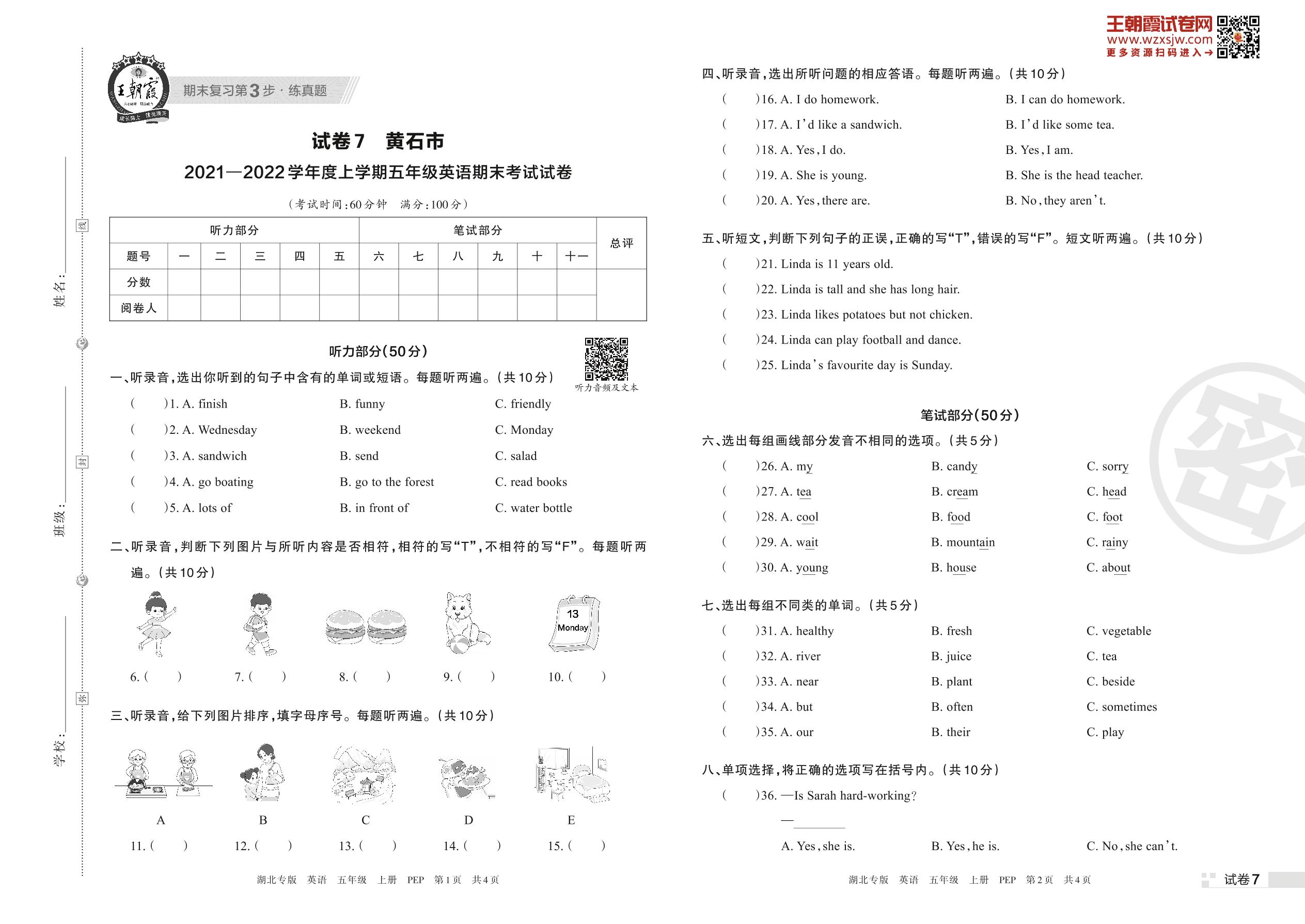 黄石市2021—2022学年度上学期五年级英语期末考试试卷(PEP版)【7】
