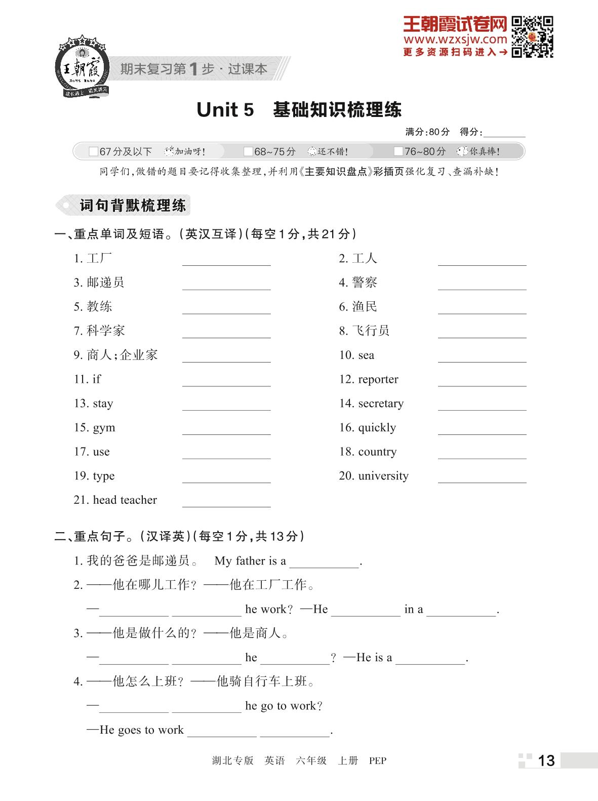 王朝霞期末过课本——Unit 5 基础知识梳理练六年级上册英语(PEP版)_R221125183649729