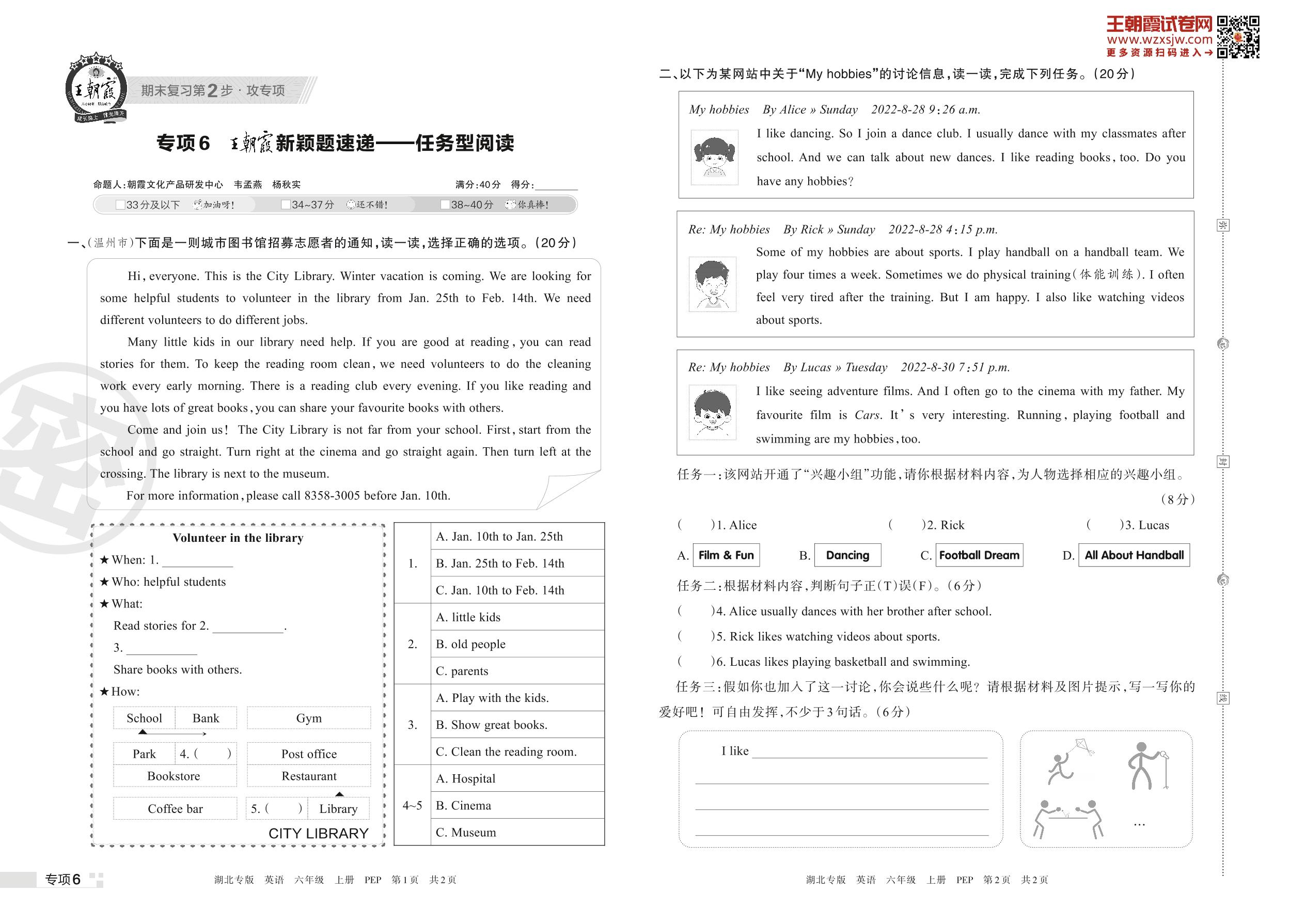 王朝霞期末专项卷——王朝霞新颖题速递:任务型阅读六年级上册英语(PEP版)_R221125183650612【6】