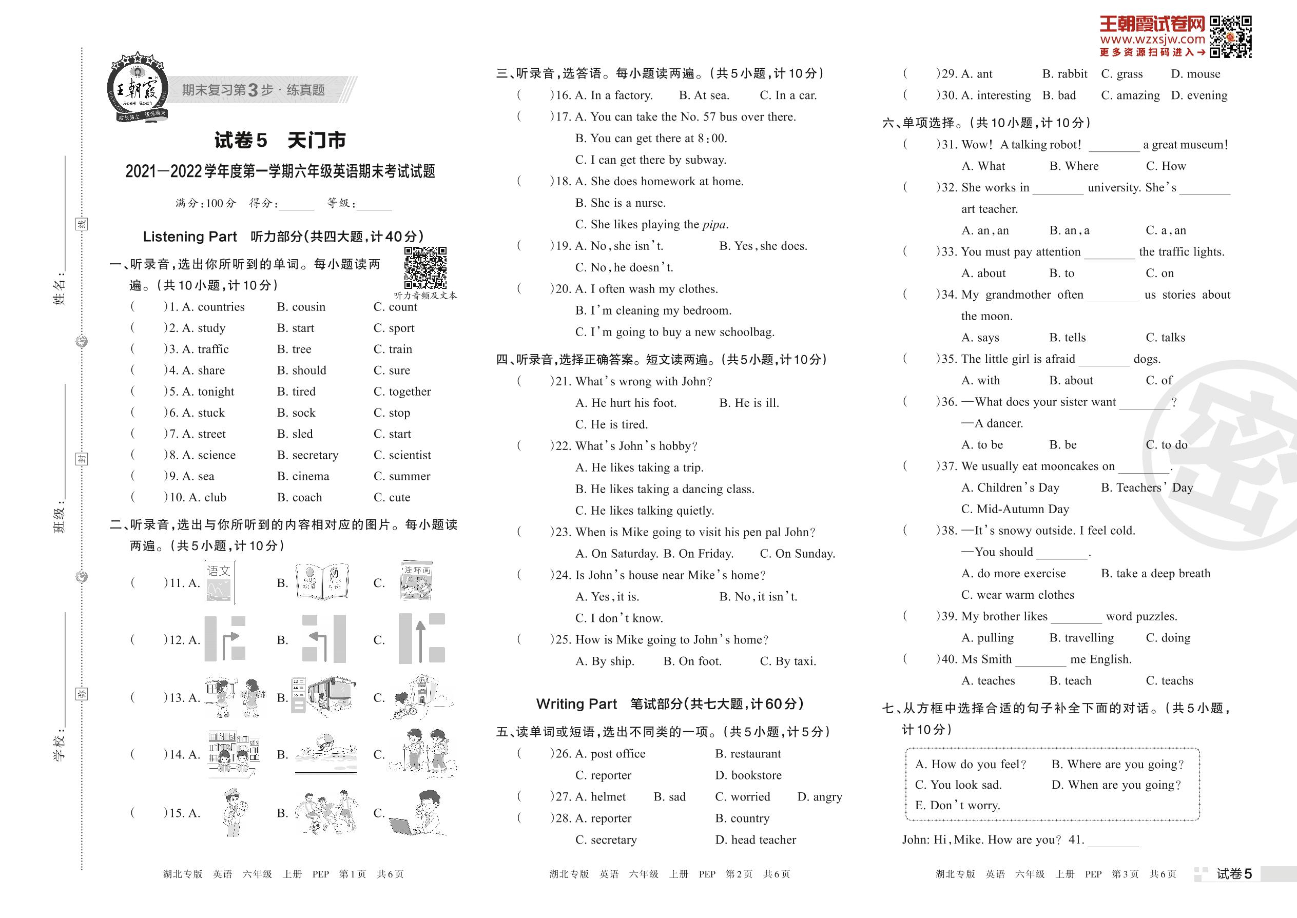 天门市2021—2022学年度第一学期六年级英语期末考试试题(PEP版)【5】