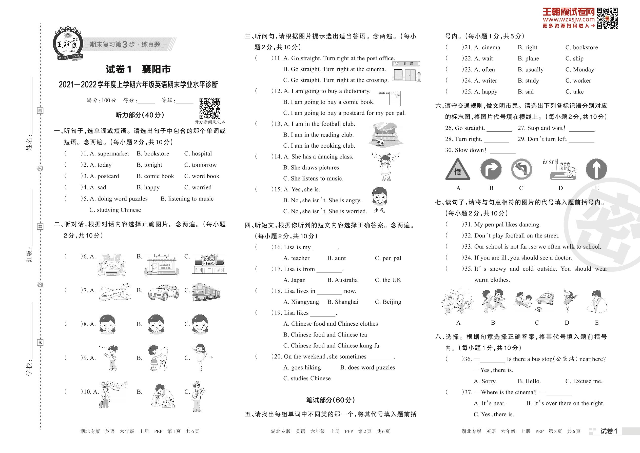 襄阳市2021—2022学年度上学期六年级英语期末学业水平诊断(PEP版)【1】