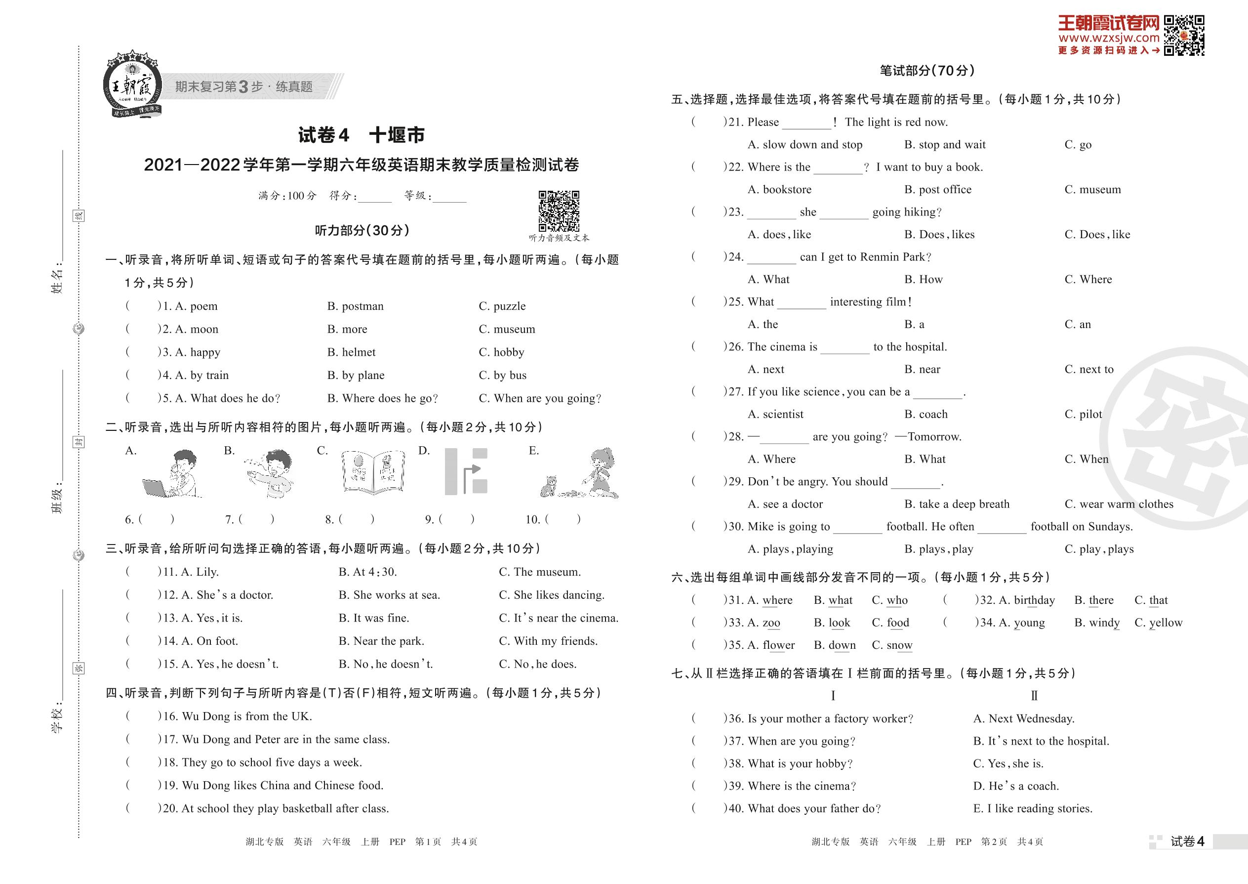 十堰市2021—2022学年第一学期六年级英语期末教学质量检测试卷(PEP版)【4】