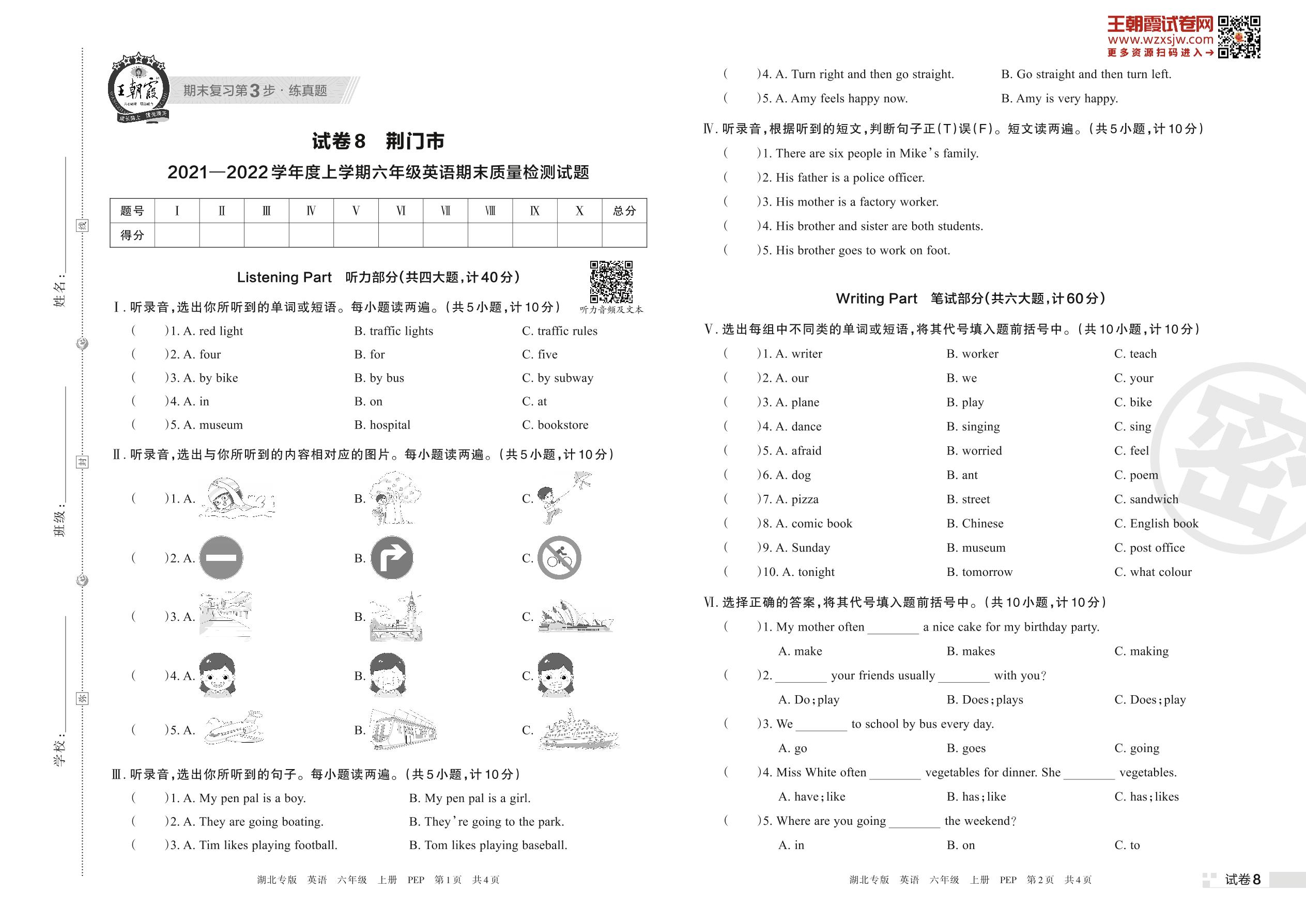 荆门市2021—2022学年度上学期六年级英语期末质量检测试题 (PEP版)【8】