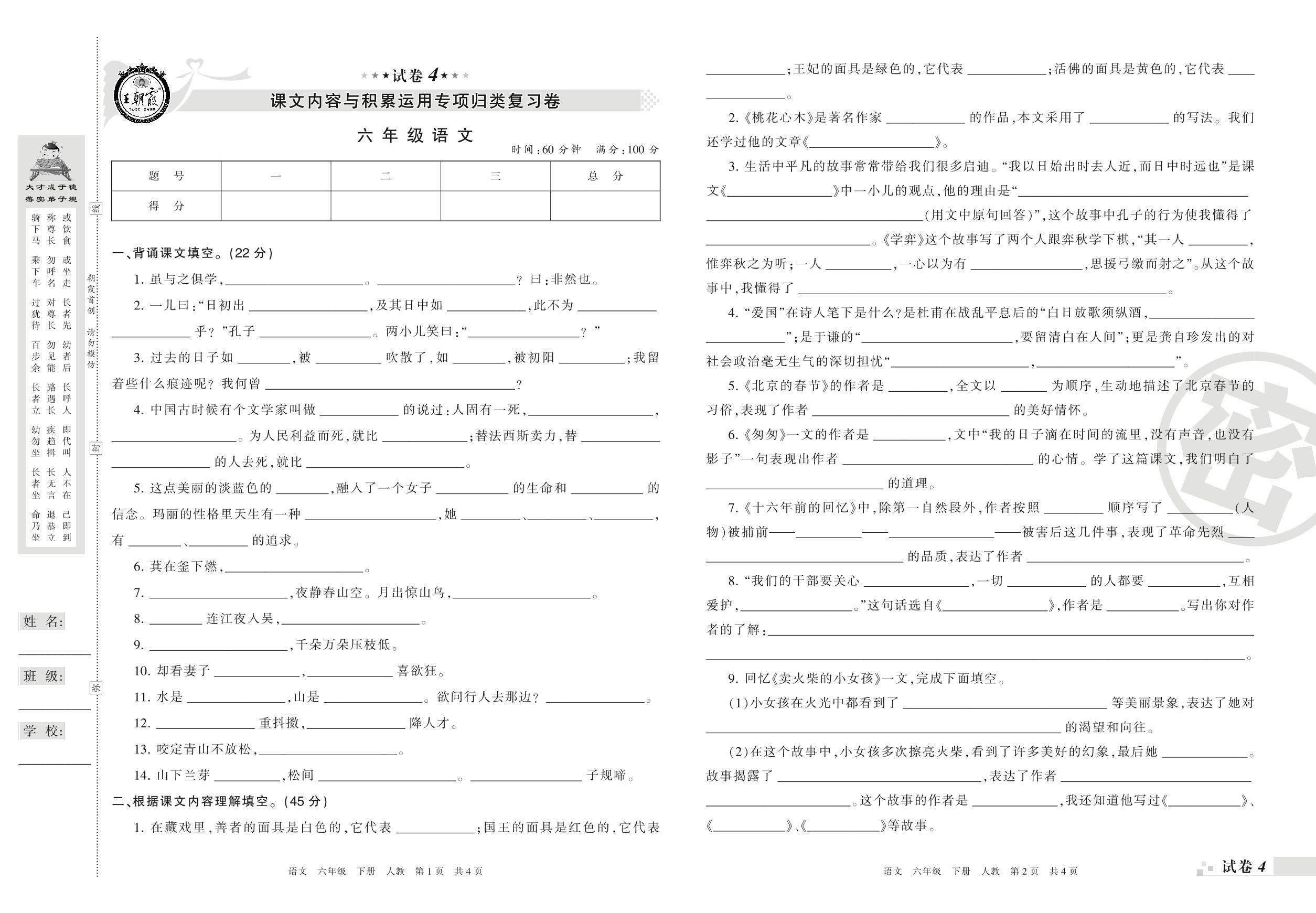 王朝霞期末专项卷——课文内容与积累运用专项归类复习卷六年级下册语文(人教版)_R210802120952【4】