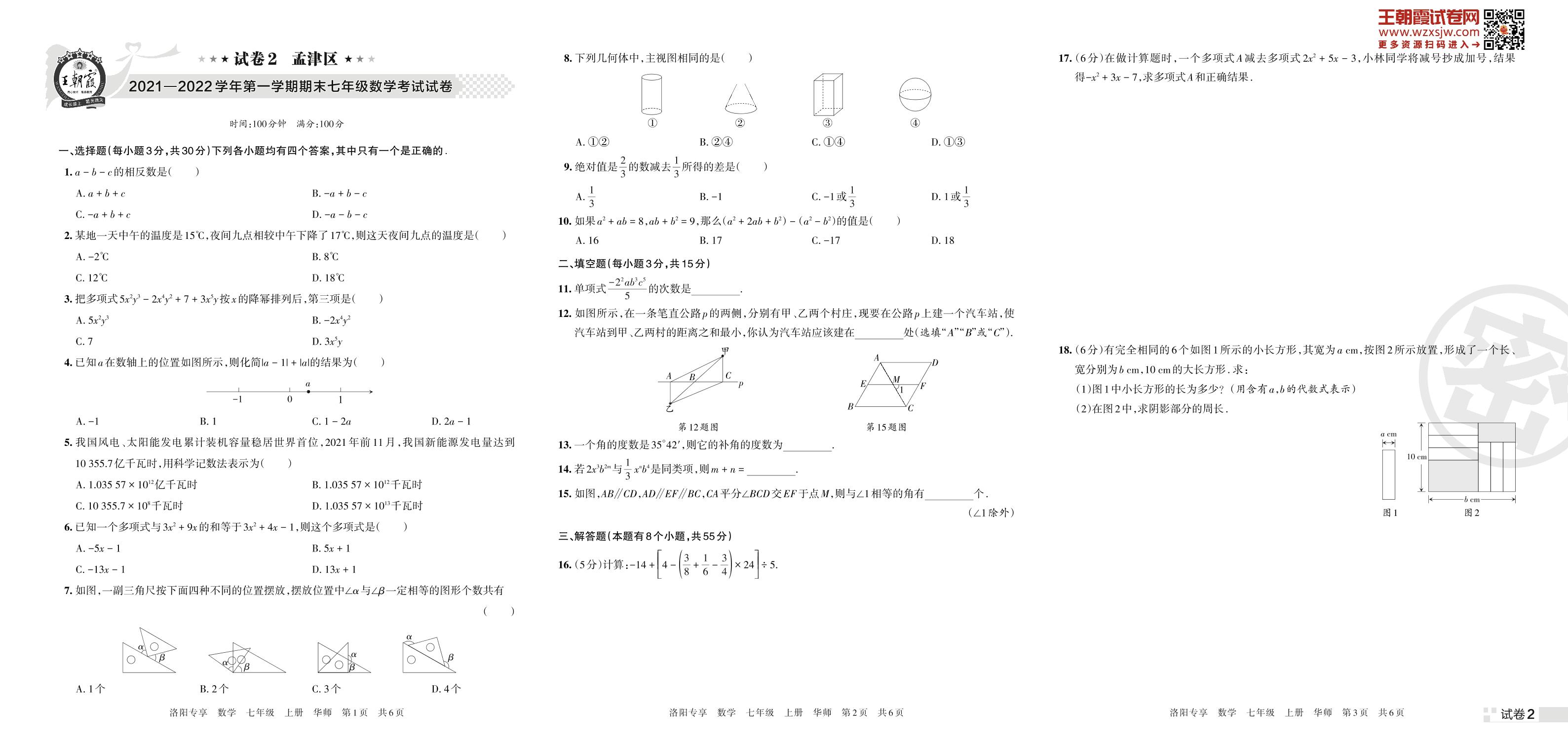 孟津区2021—2022学年第一学期期末七年级数学考试试卷(华师版)【2】