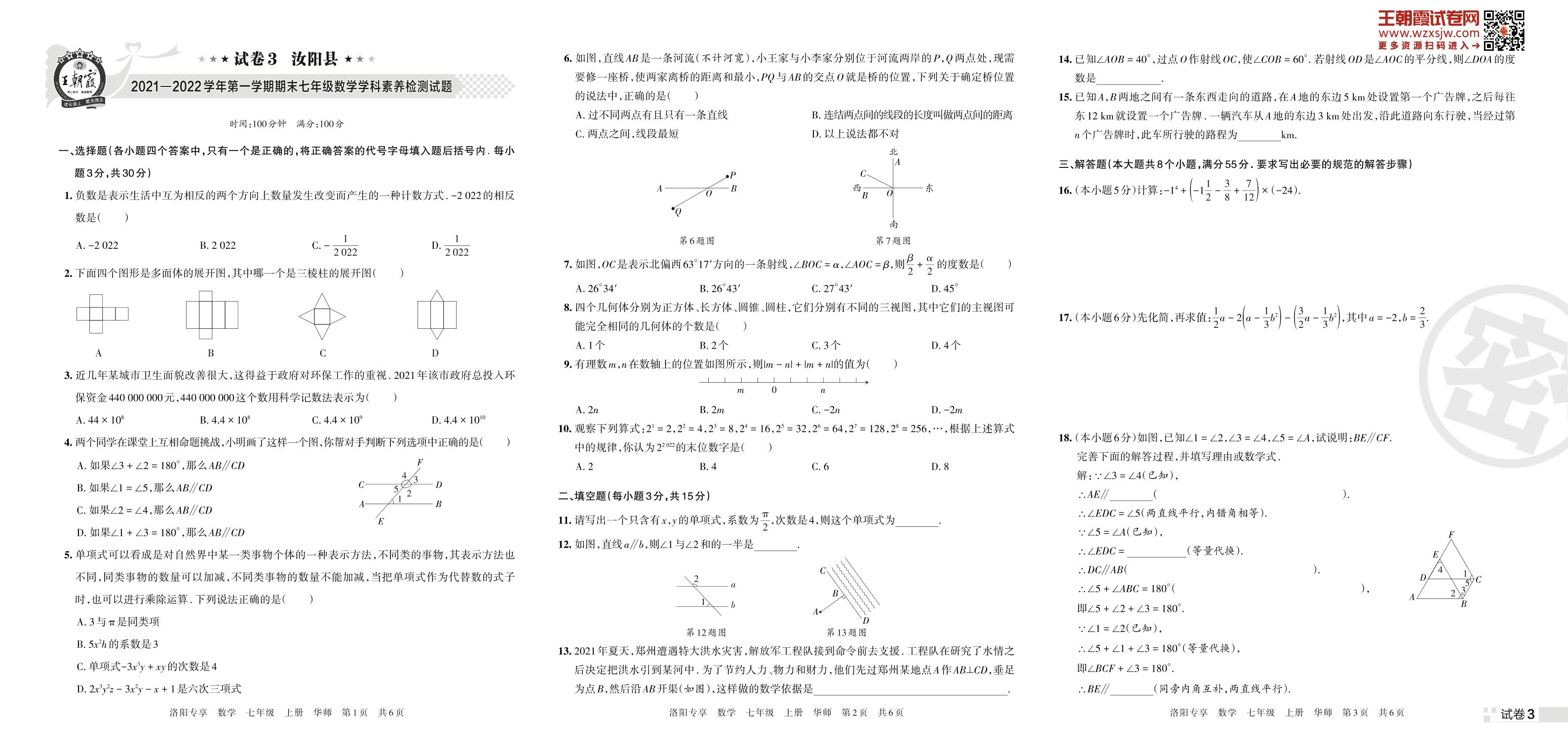 汝阳县2021—2022学年第一学期期末七年级数学学科素养检测试题(华师版)【3】