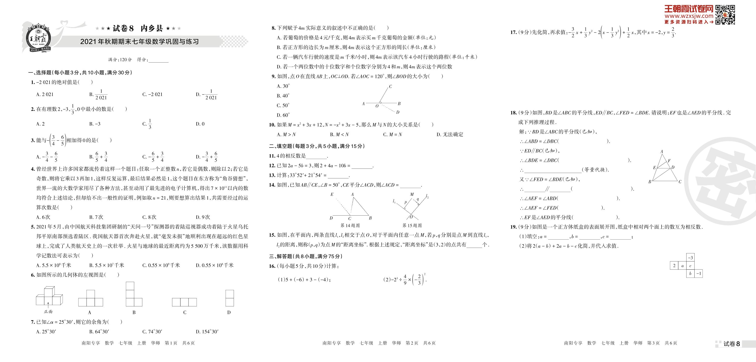 内乡县2021年秋期期末七年级数学巩固与练习(华师版)【8】