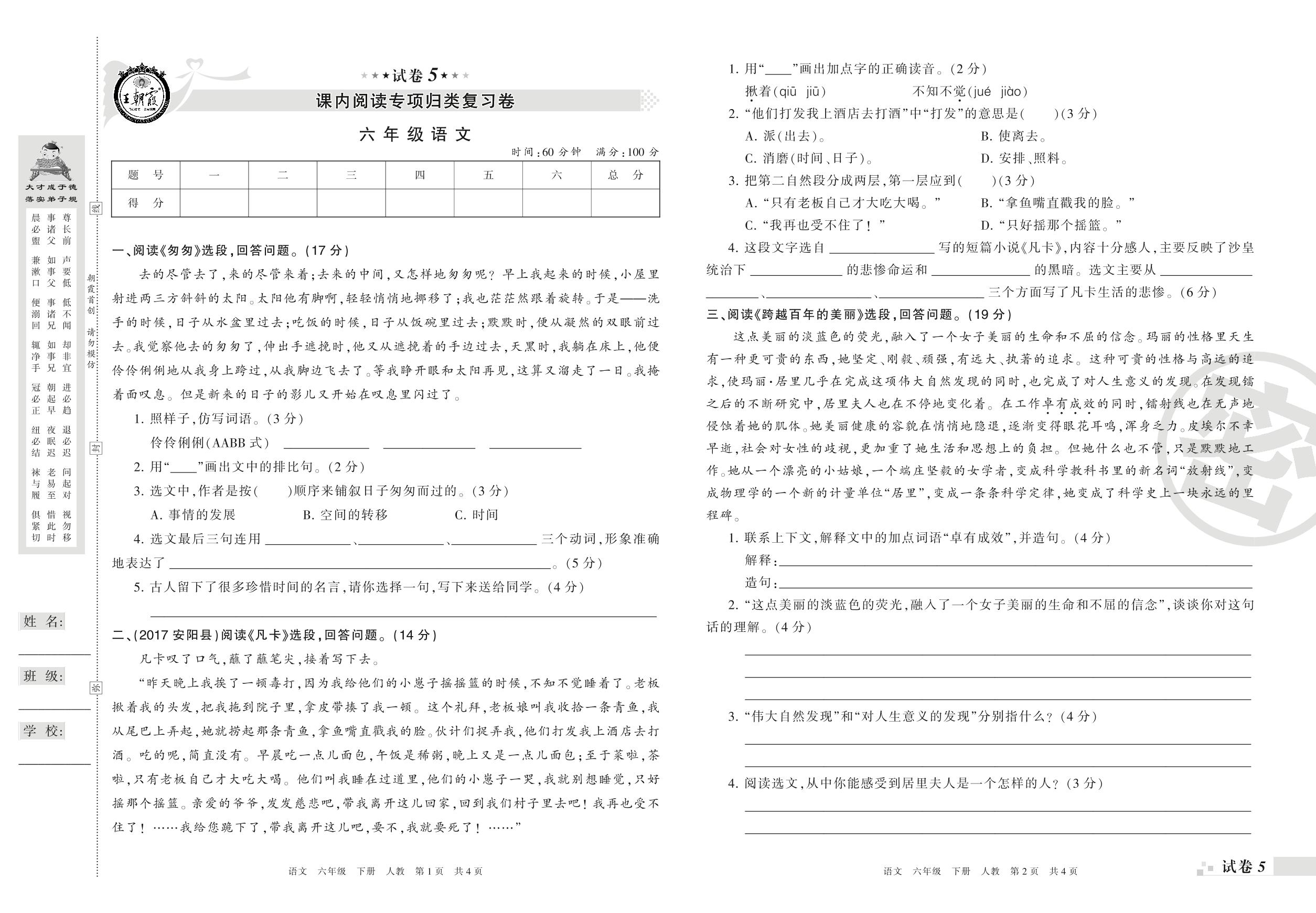 王朝霞期末专项卷——课内阅读专项归类复习卷六年级下册语文(人教版)_R210802120958【5】