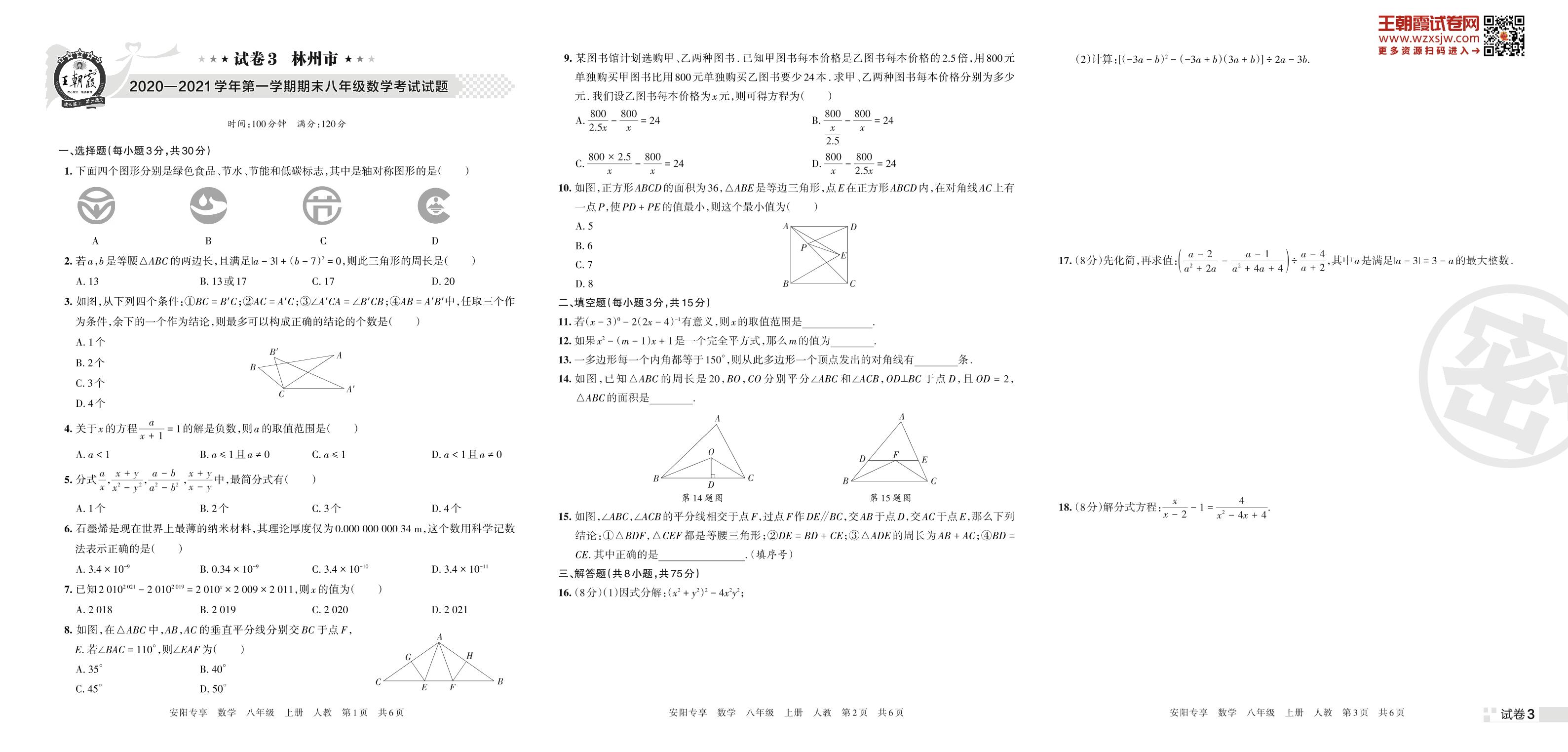 林州市2020—2021学年第一学期期末八年级数学考试试题(人教版)【3】