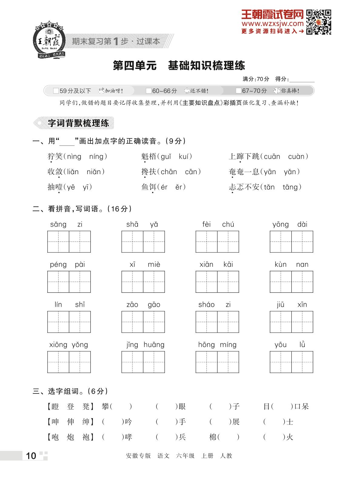 王朝霞期末过课本——第四单元 基础知识梳理练六年级上册语文(人教版)_R221125204426350