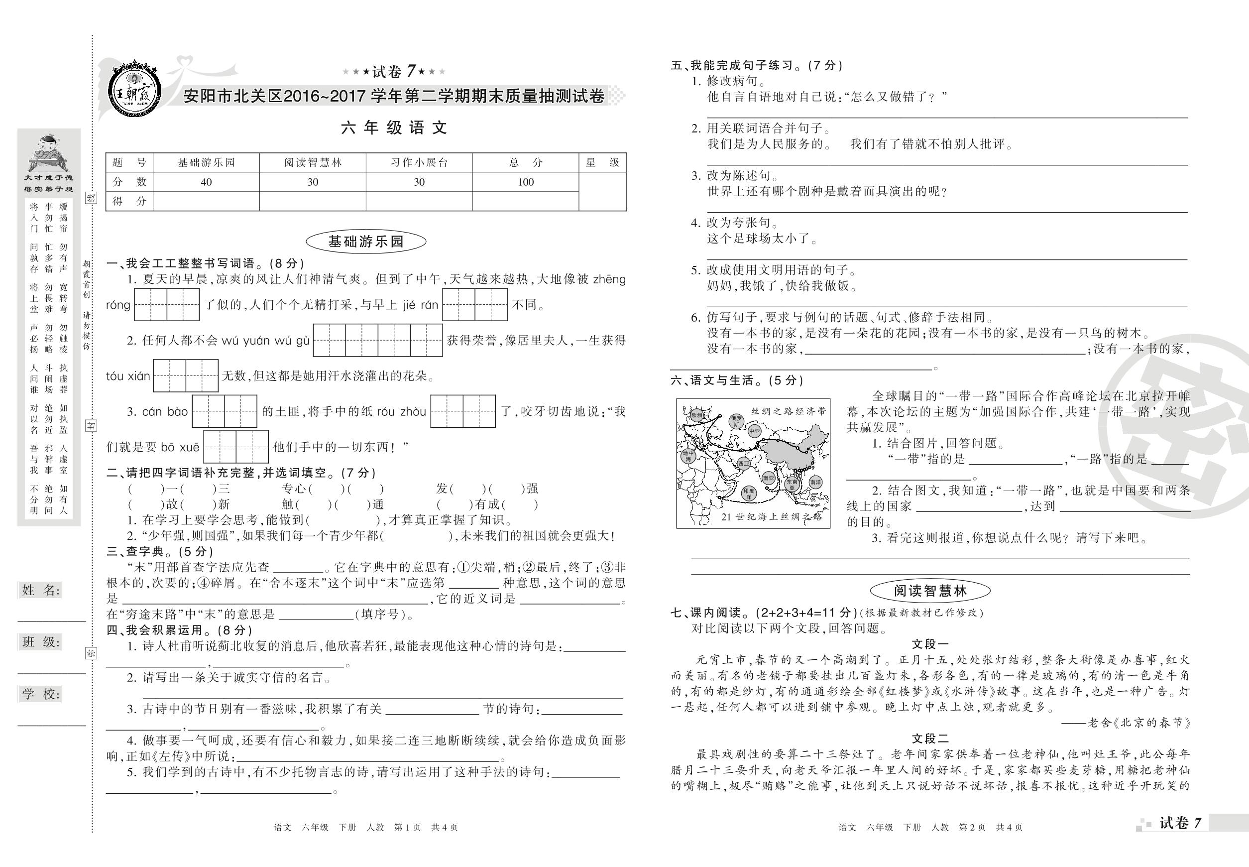 2016-2017学年第二学期安阳市北关区六年级语文试卷(人教版)【7】