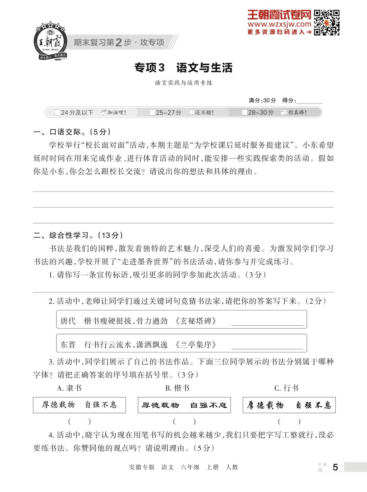 王朝霞期末专项卷——语文与生活六年级上册语文(人教版)【3】
