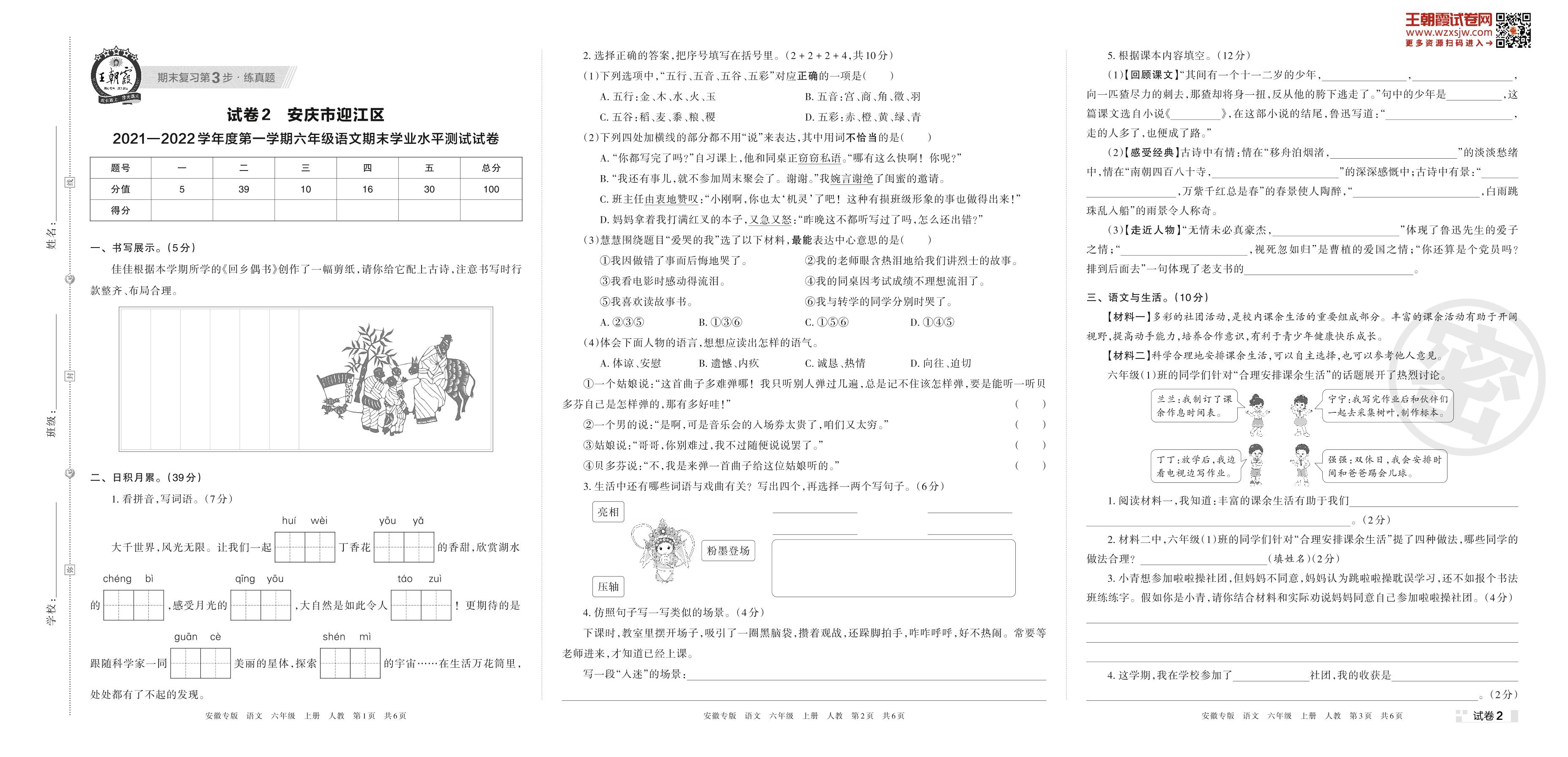 安庆市迎江区2021—2022学年度第一学期六年级语文期末学业水平测试试卷(人教版)【2】