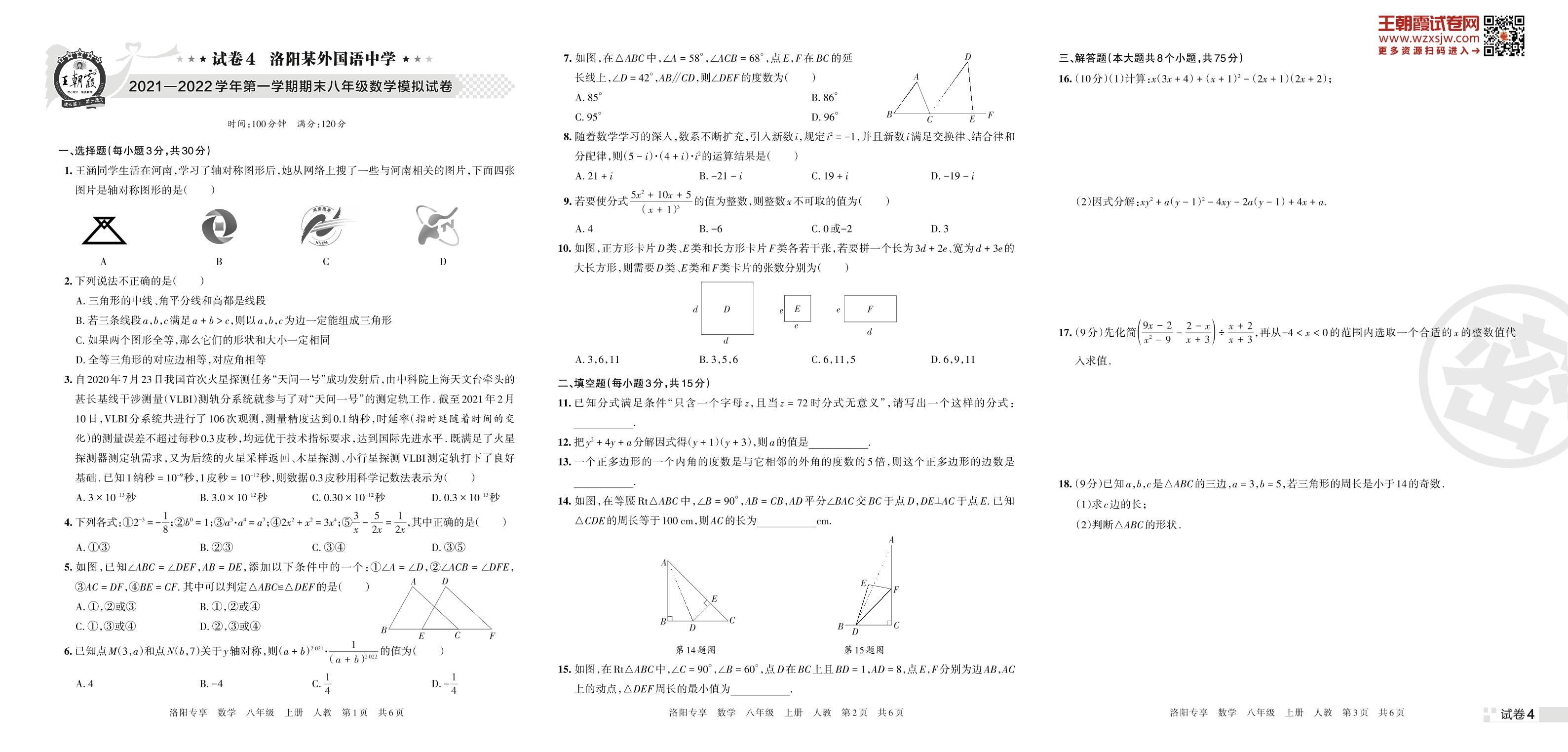 洛阳某外国语中学2021—2022学年第一学期期末八年级数学模拟试卷(人教版)【4】