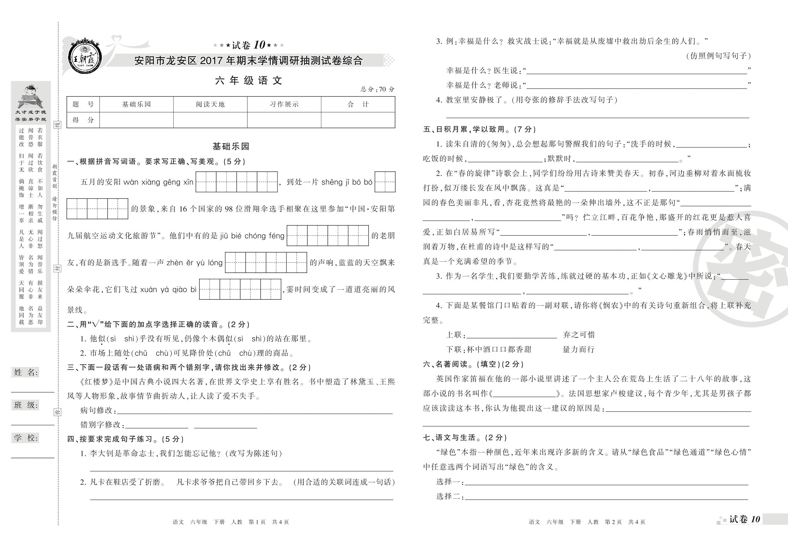 2016-2017学年第二学期安阳市龙安区六年级语文试卷(人教版)【10】