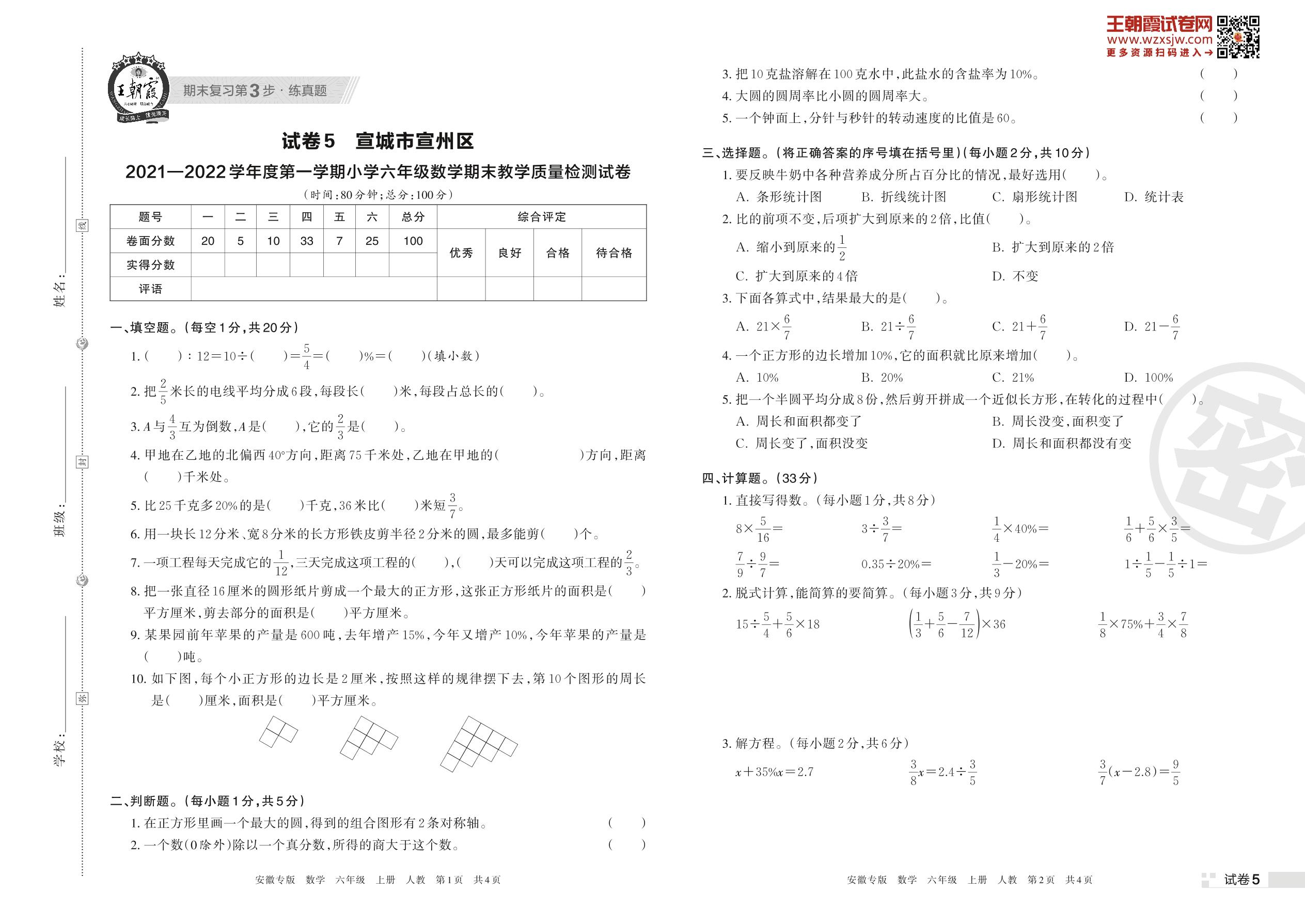 宣城市宣州区2021—2022学年度第一学期小学六年级数学期末教学质量检测试卷(人教版)【5】