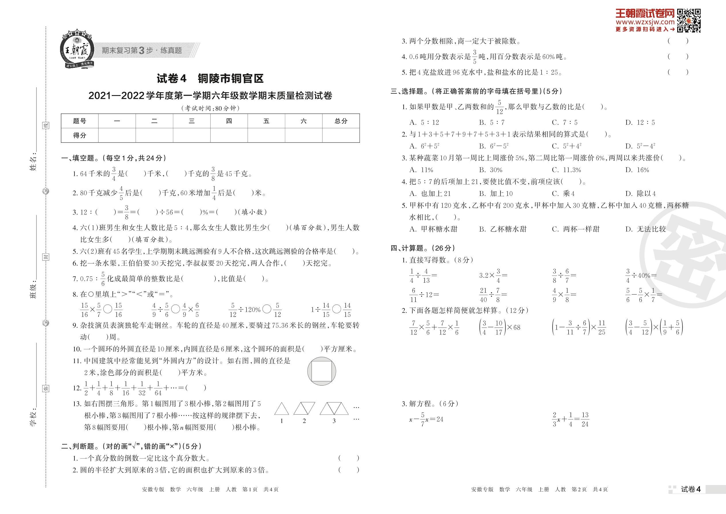 铜陵市铜官区2021—2022学年度第一学期六年级数学期末质量检测试卷(人教版)【4】
