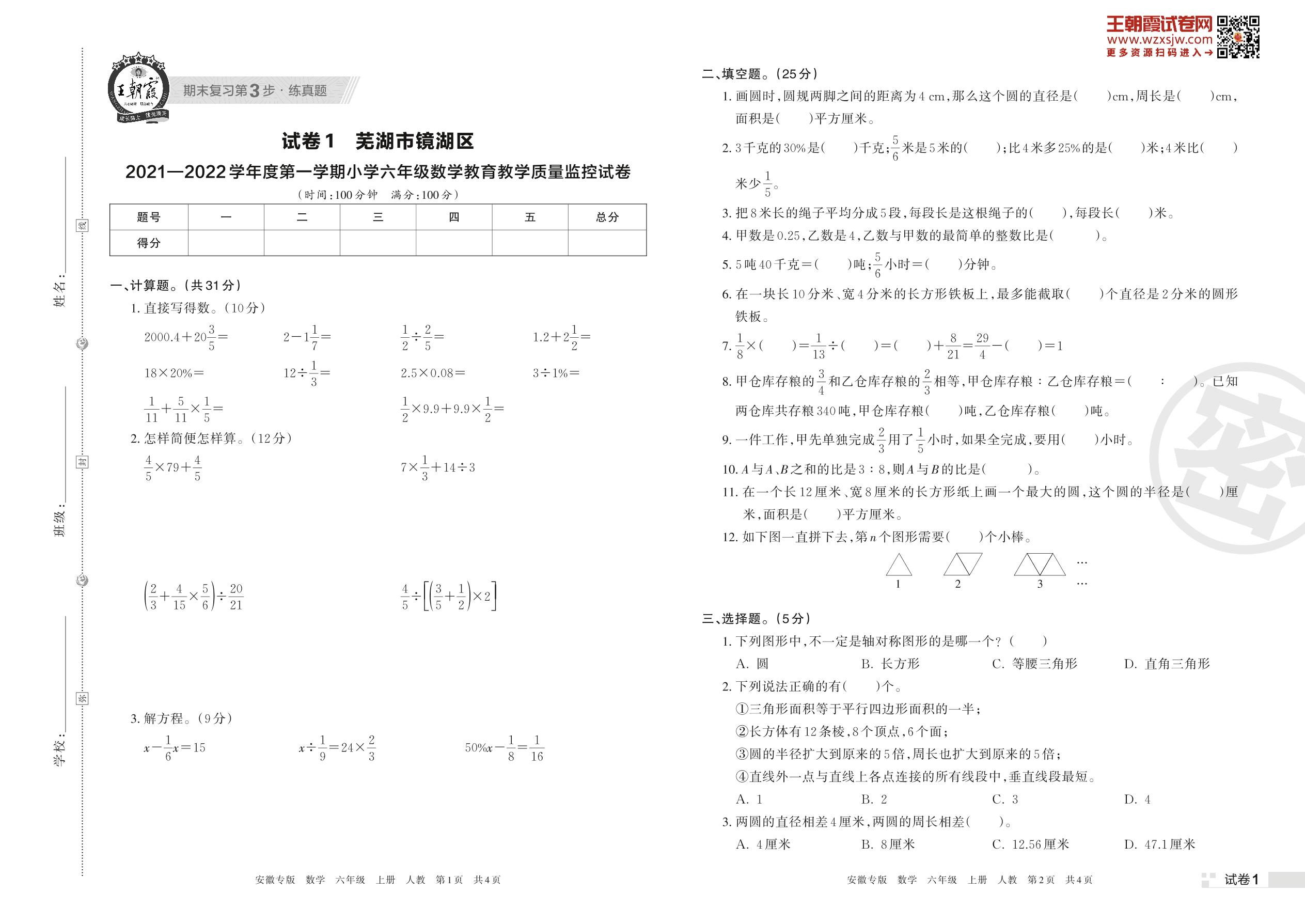 芜湖市镜湖区2021—2022学年度第一学期小学六年级数学教育教学质量监控试卷(人教版)【1】