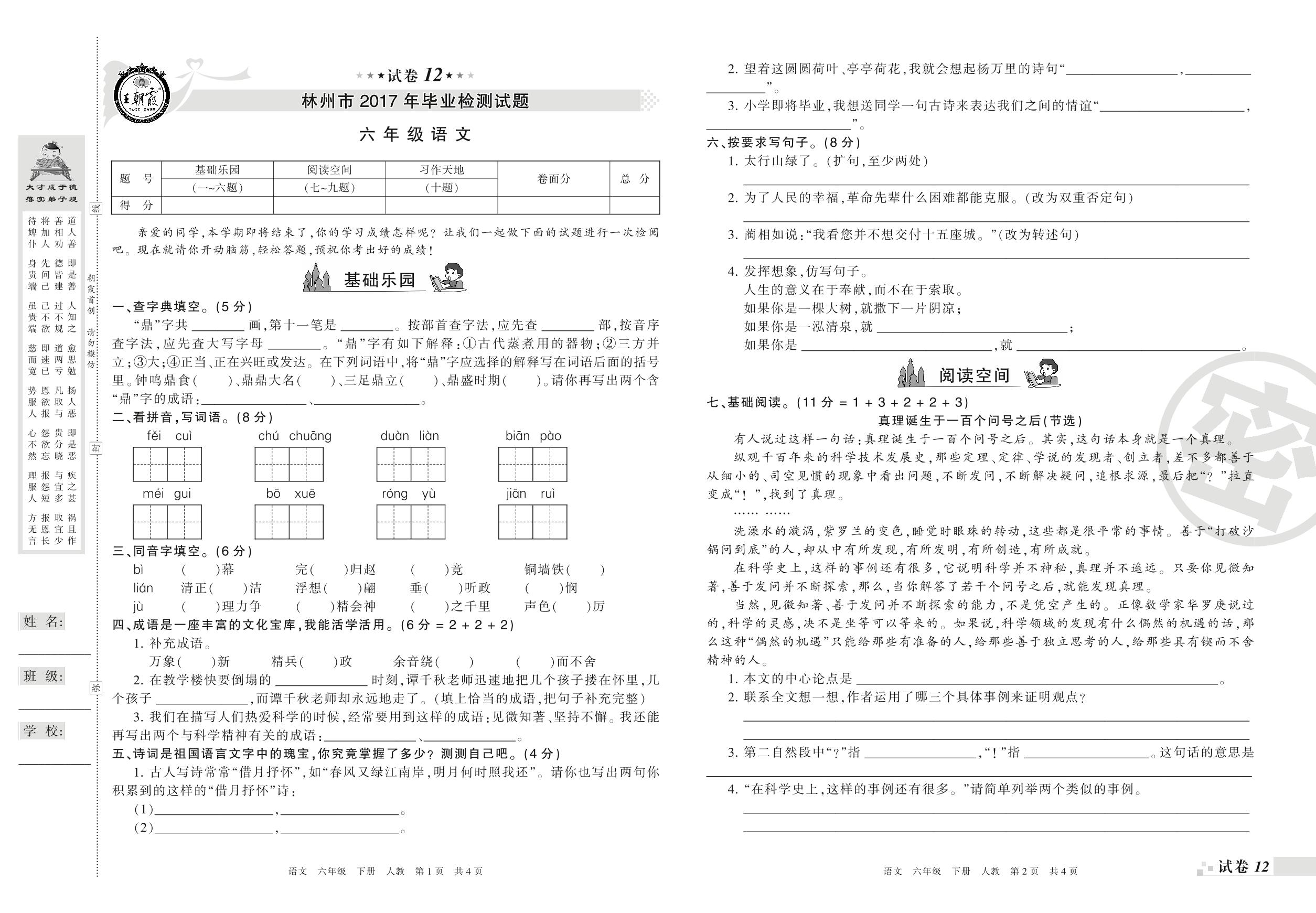 2016-2017学年第二学期林州市六年级语文试卷(人教版)【12】