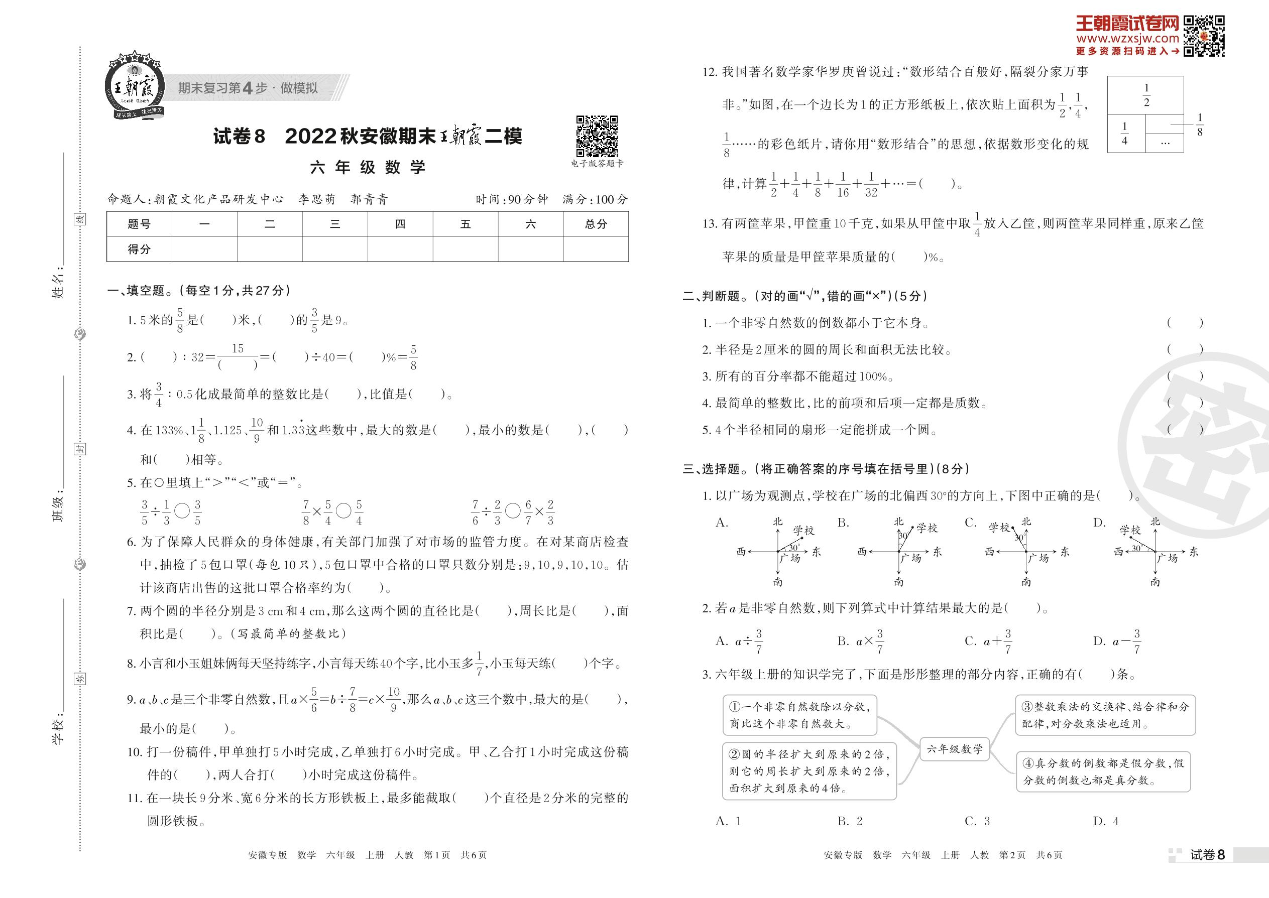 王朝霞期末模拟卷六年级上册数学(人教版)_R221125205212796【8】