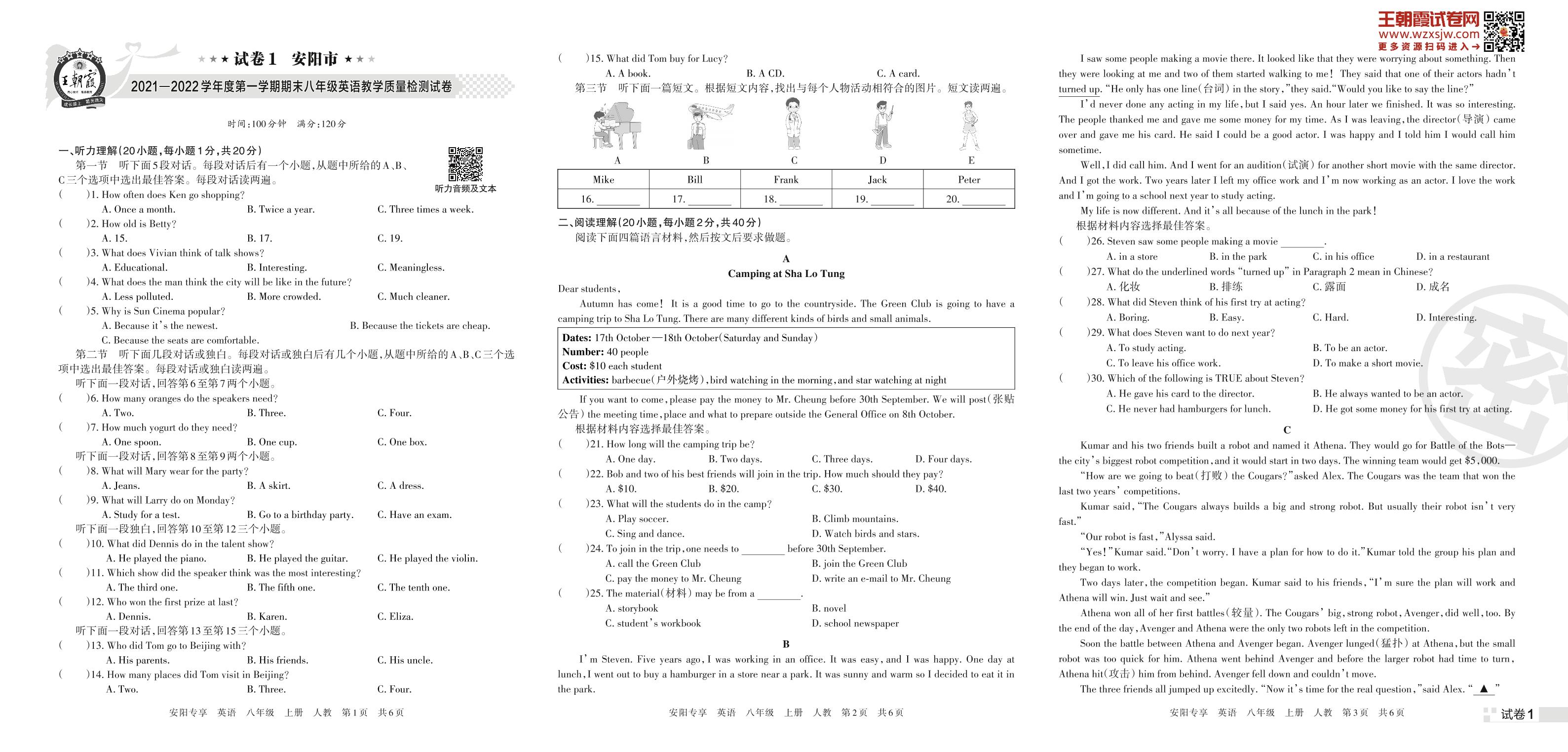 安阳市2021—2022学年度第一学期期末八年级英语教学质量检测试卷(人教版)【1】