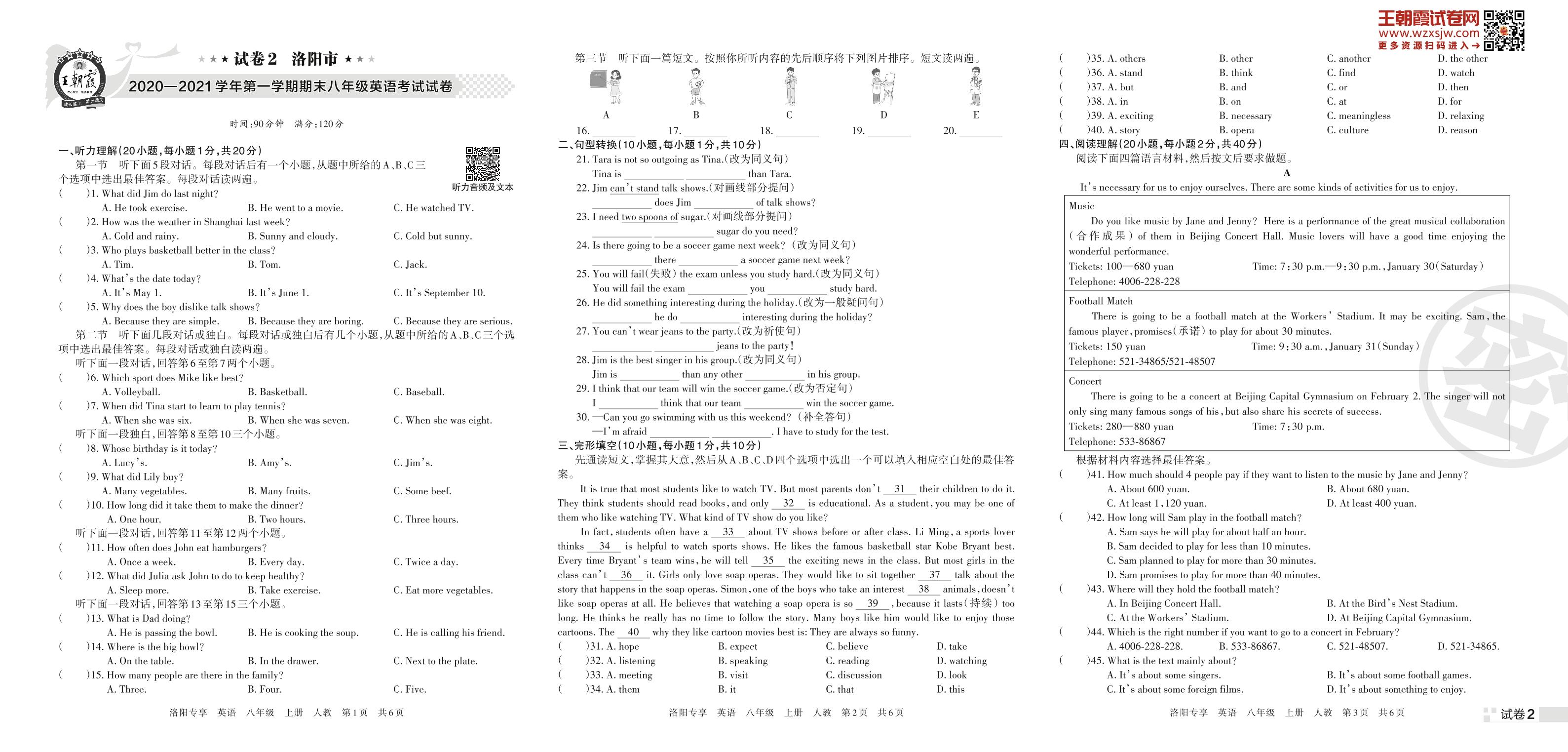 洛阳市2020—2021学年第一学期期末八年级英语考试试卷(人教版)【2】