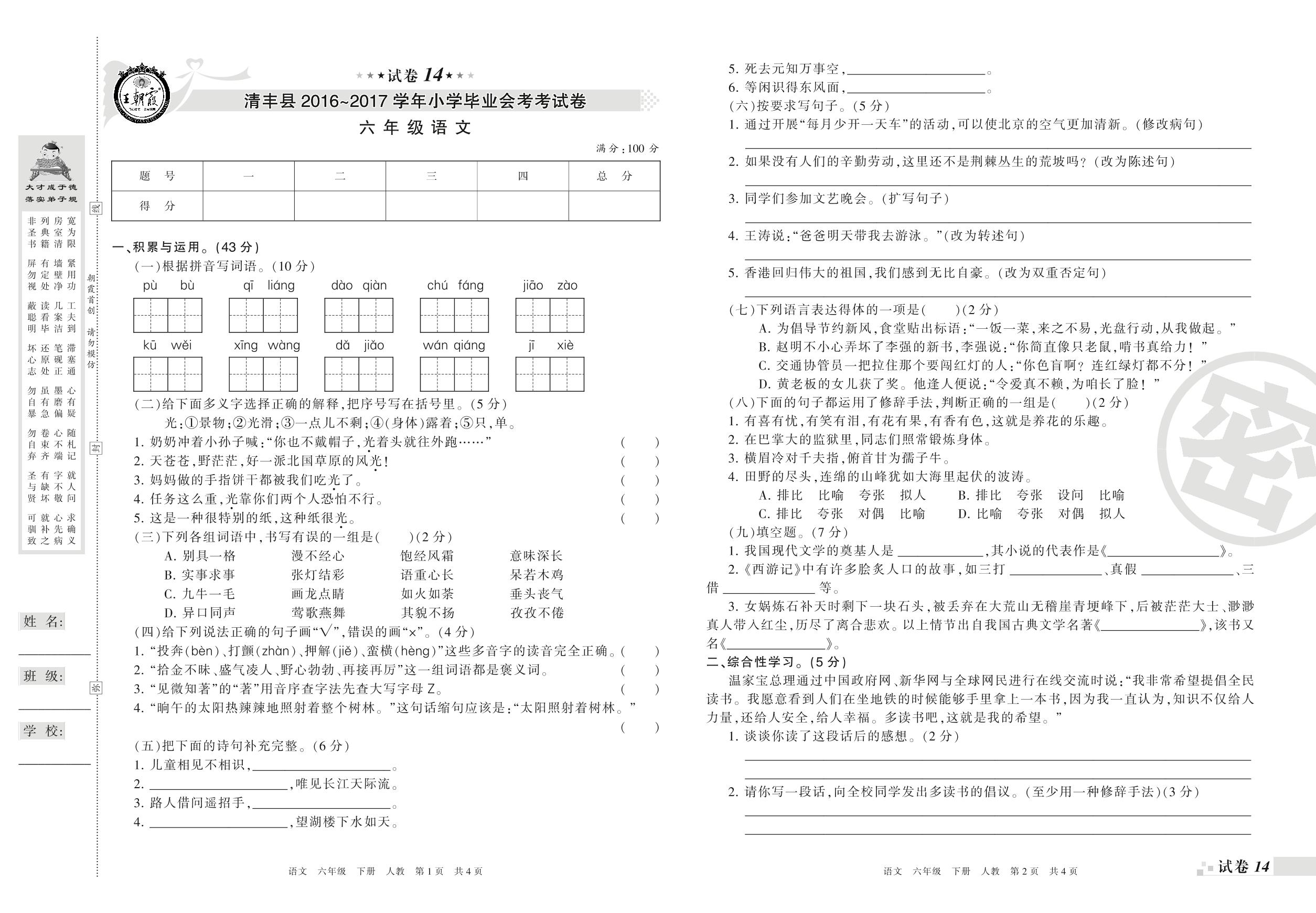 2016-2017学年第二学期濮阳市清丰县六年级语文试卷(人教版)【14】