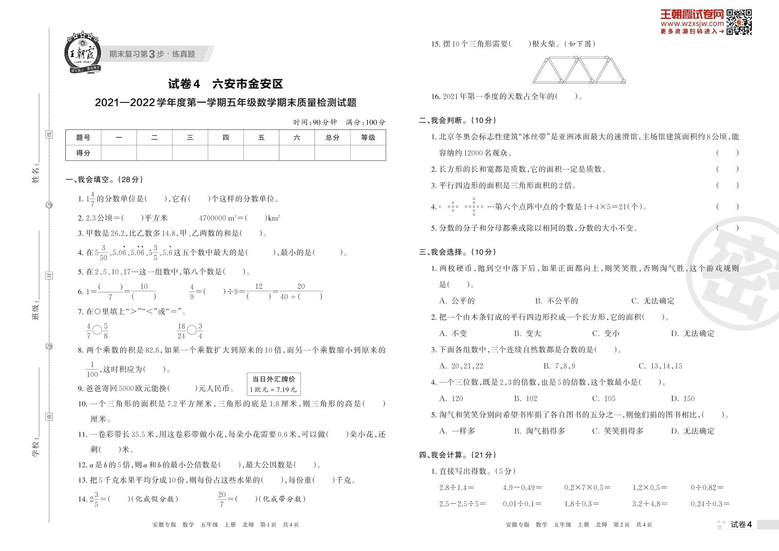 六安市金安区2021—2022学年度第一学期五年级数学期末质量检测试题(北师版)【4】