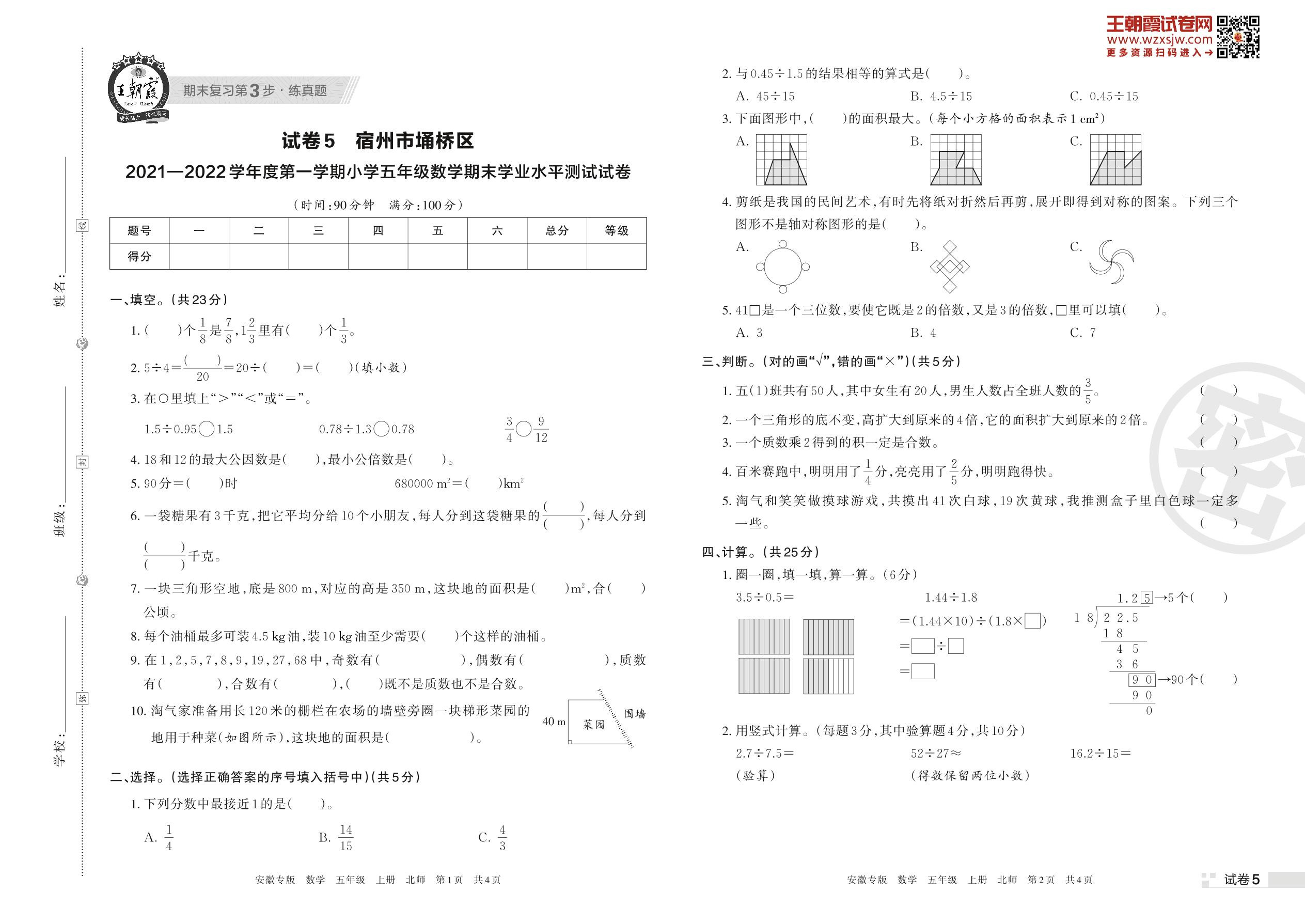 宿州市埇桥区2021—2022学年度第一学期小学五年级数学期末学业水平测试试卷(北师版)【5】