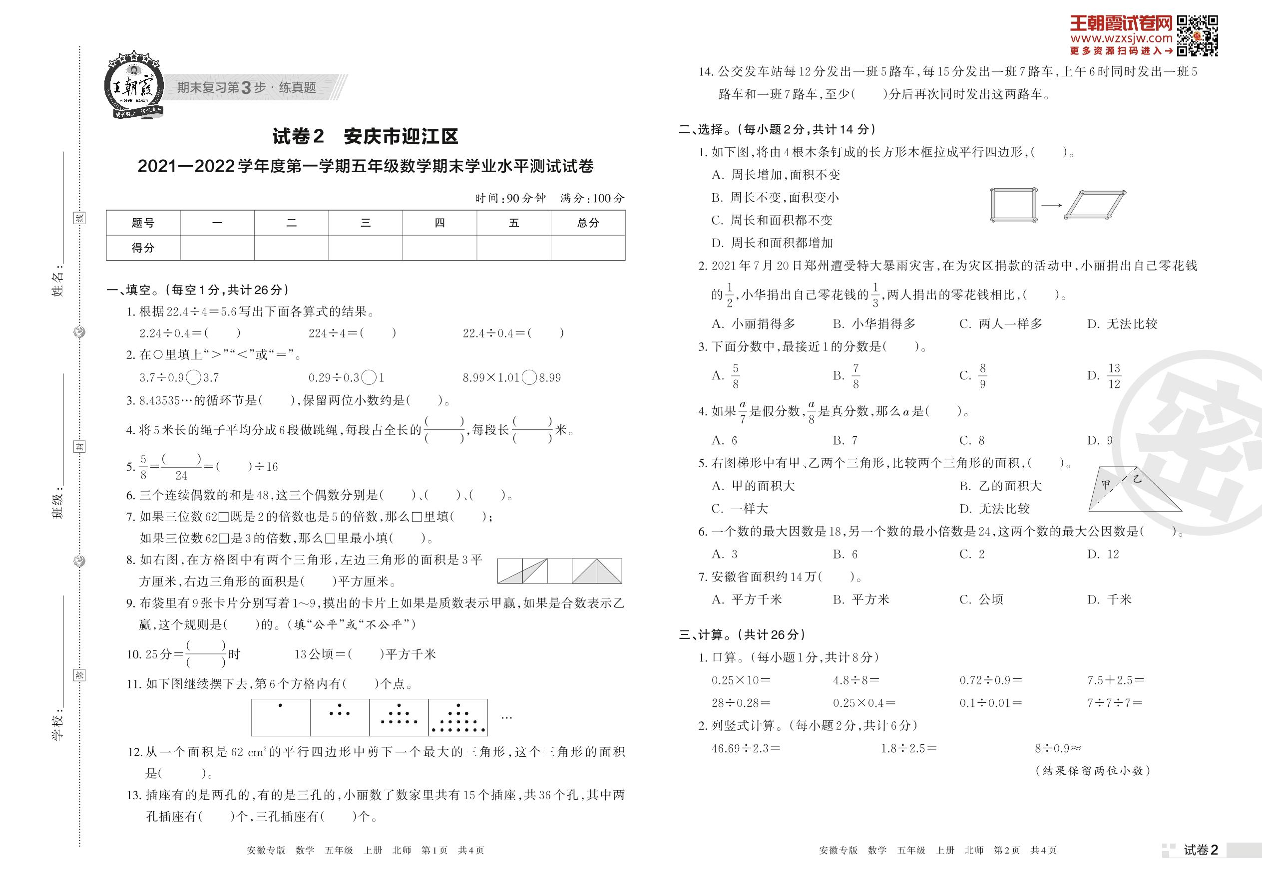 安庆市迎江区2021—2022学年度第一学期五年级数学期末学业水平测试试卷(北师版)【2】