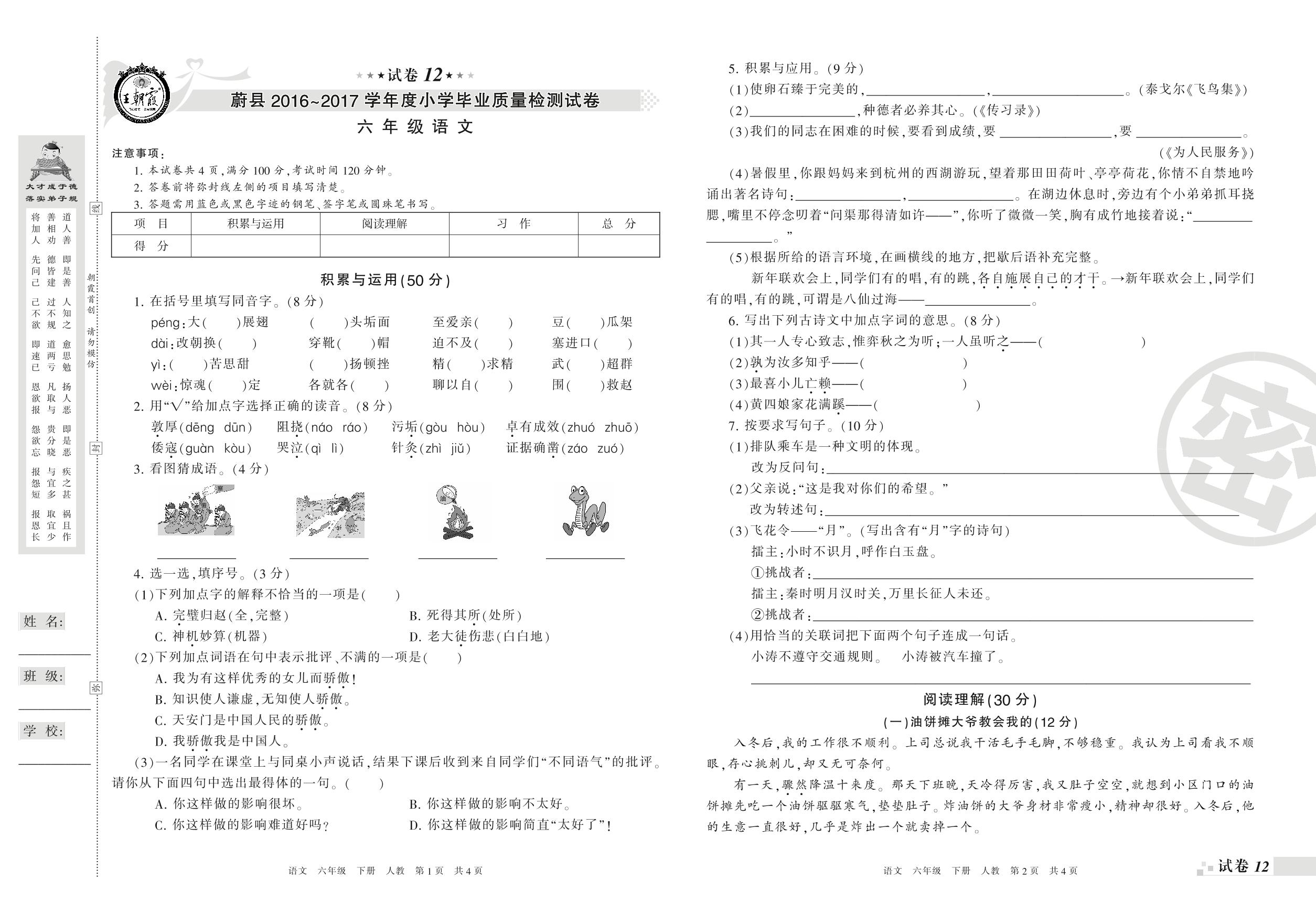 2016-2017学年第二学期张家口市蔚县六年级语文试卷(人教版)【12】