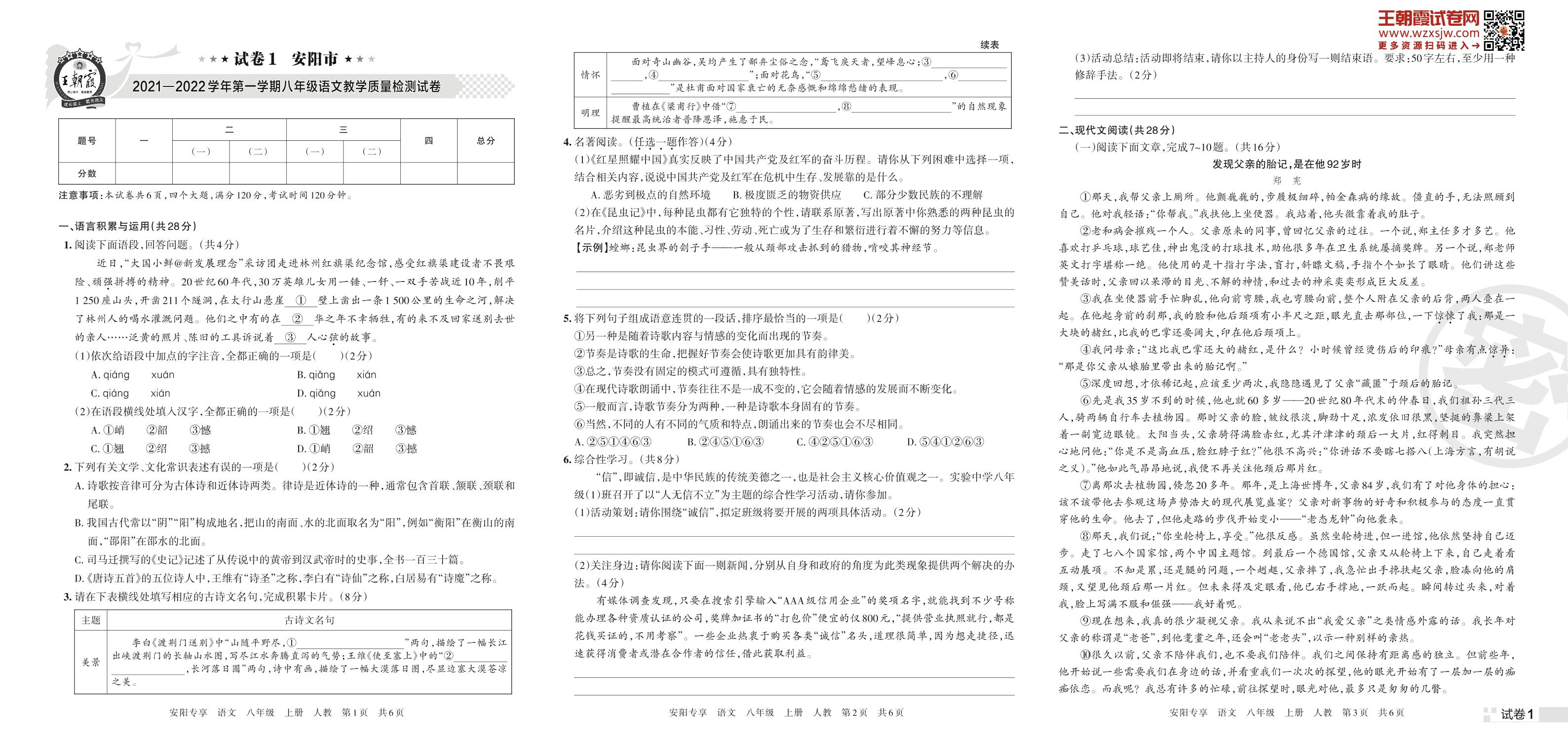 安阳市2021—2022学年第一学期八年级语文教学质量检测试卷(人教版)【1】