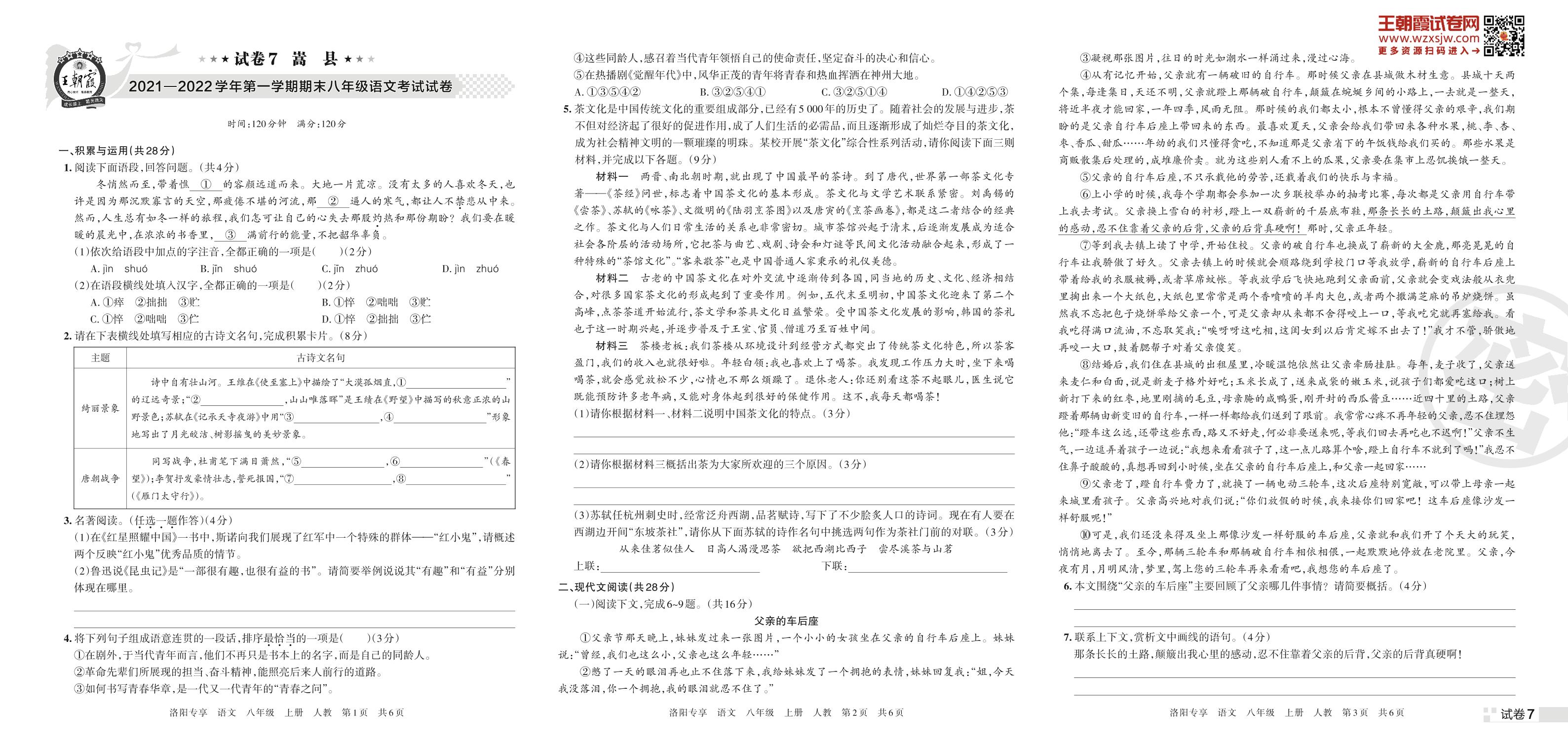嵩县2021—2022学年第一学期期末八年级语文考试试卷(人教版)【7】