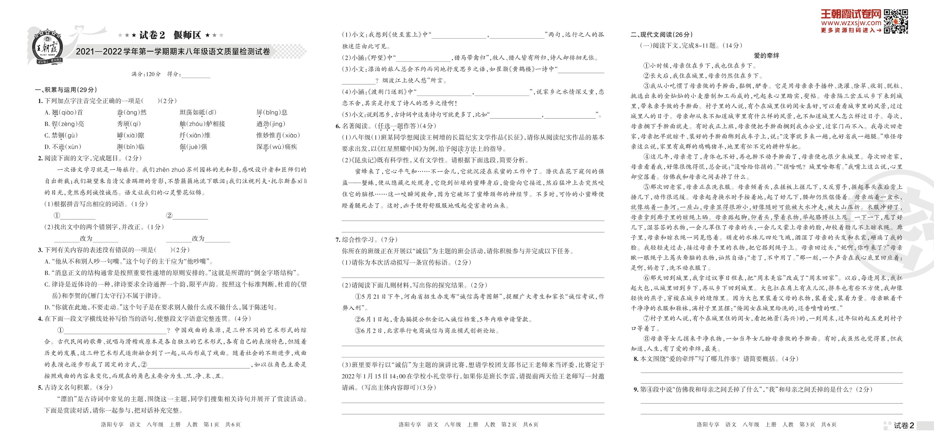 偃师区2021—2022学年第一学期期末八年级语文质量检测试卷(人教版)【2】
