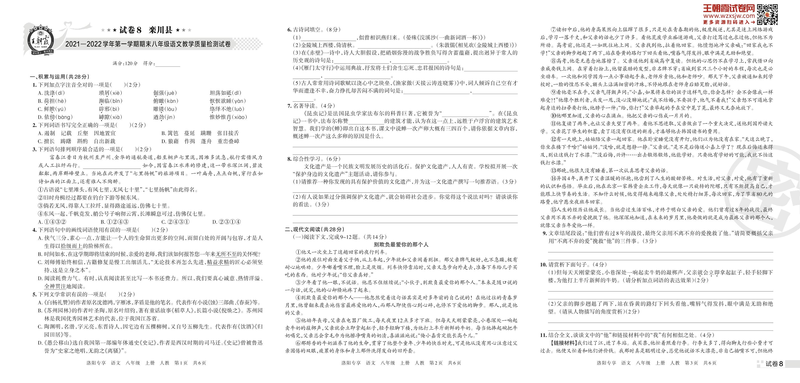 栾川县2021—2022学年第一学期期末八年级语文教学质量检测试卷(人教版)【8】