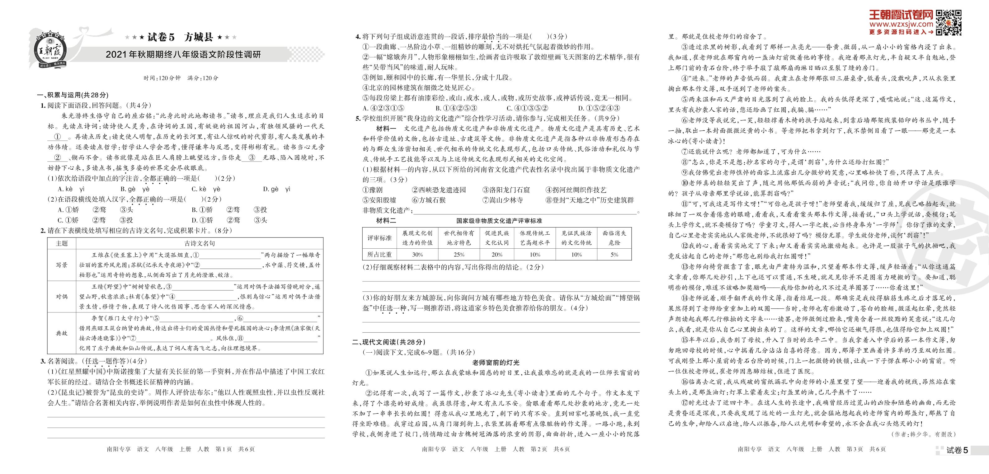 方城县2021年秋期期终八年级语文阶段性调研(人教版)【5】
