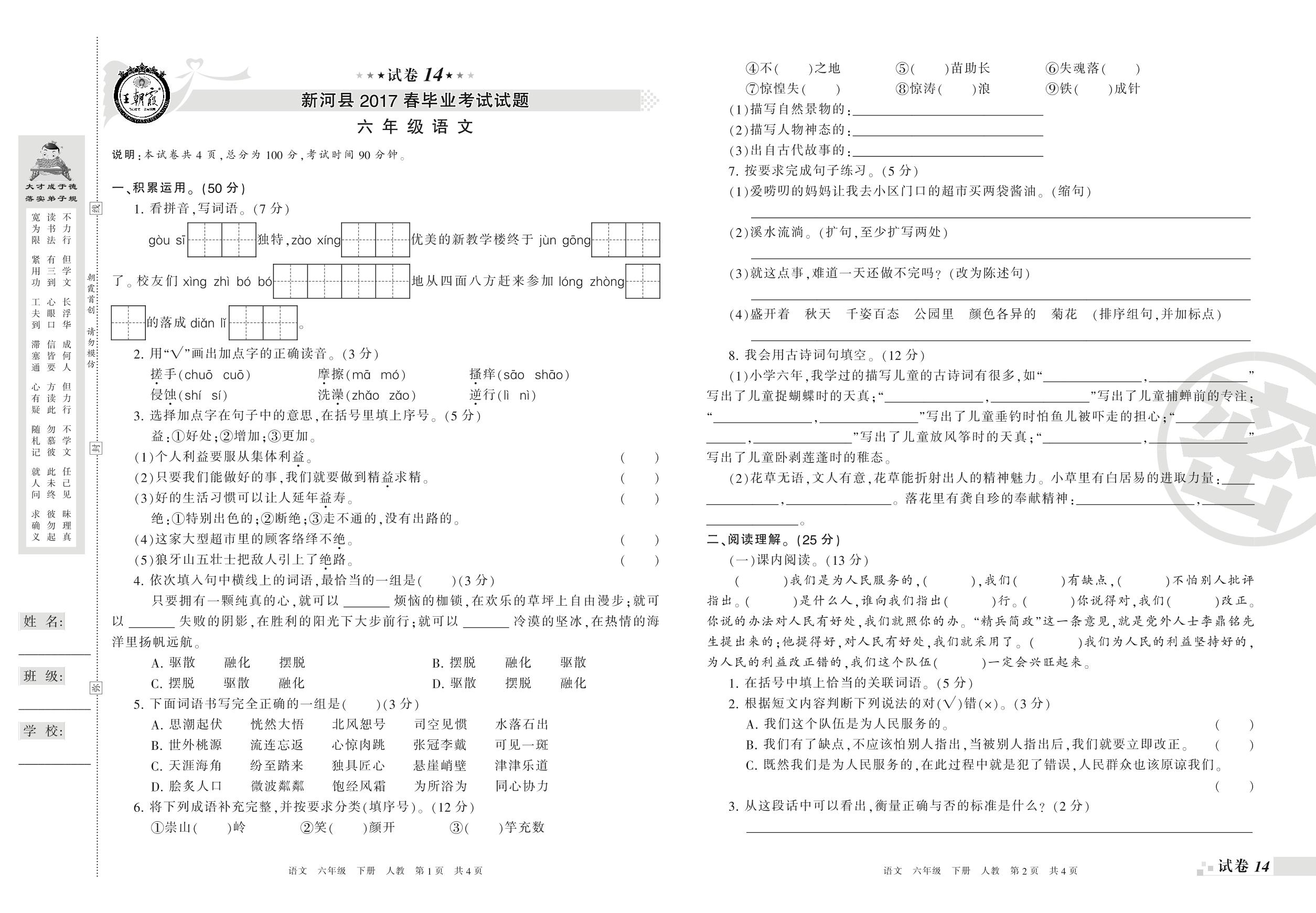 2016-2017学年第二学期邢台市新河县六年级语文试卷(人教版)【14】